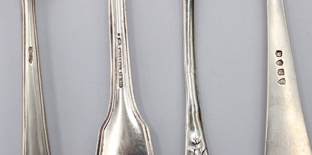 4x ältere Silber-Gabeln, je mit Monogramm, 3x 800er, 1x ungepunzt, zus. 217gr., L-21,3cm [1]