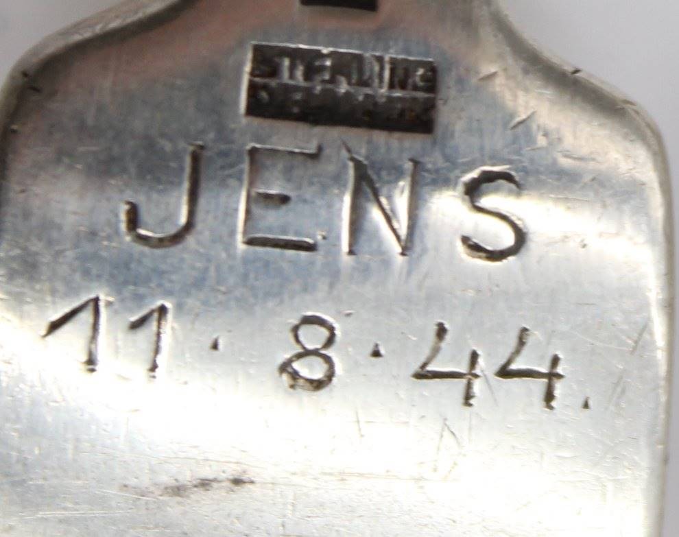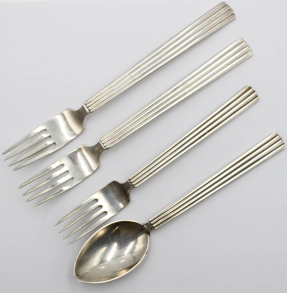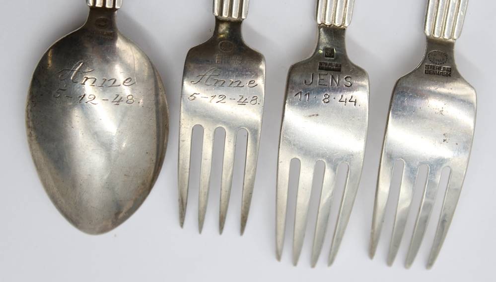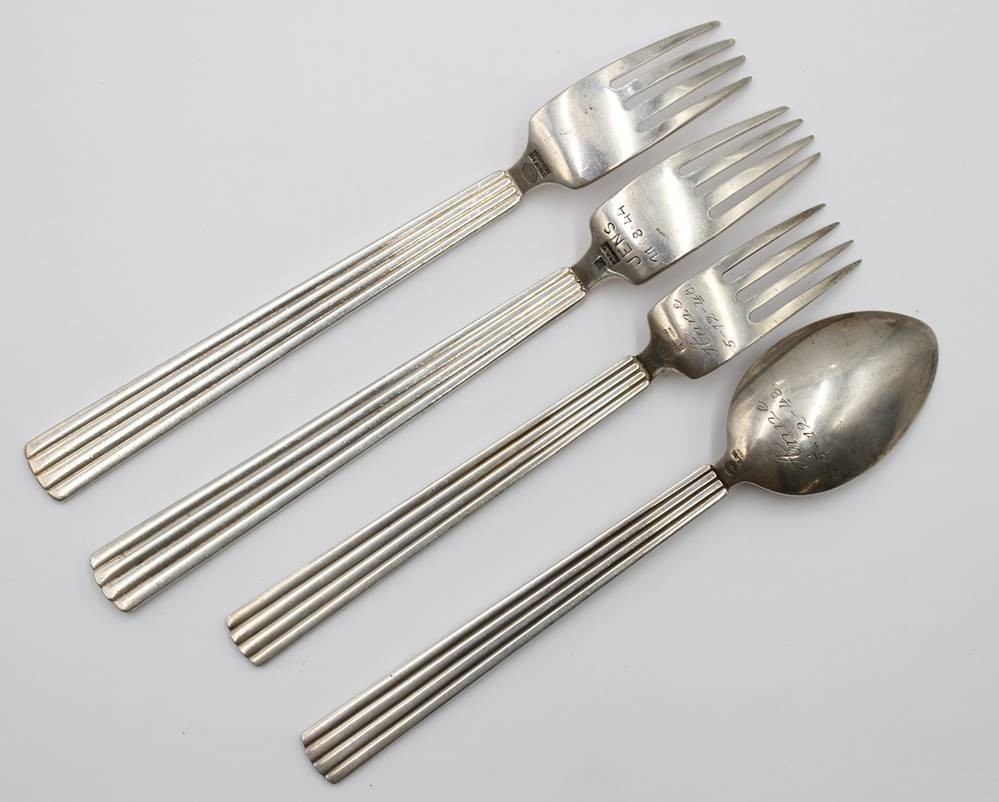 4x Besteckteile, Georg Jensen, Bernadotte, älter, 3 Gabeln und ein Löffel, 3 Teile mit Namensgravuren und Datierungen, Sterling, 190,97gr., L-ca. 15,5 > 17cm [1]