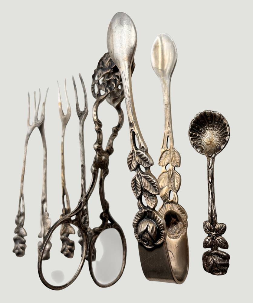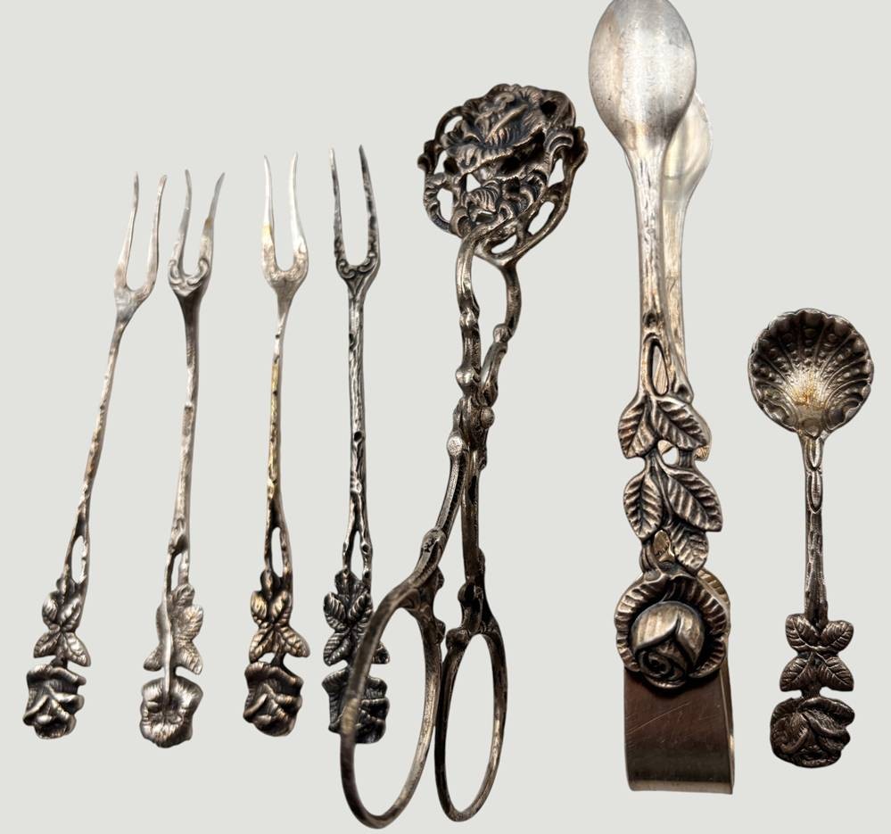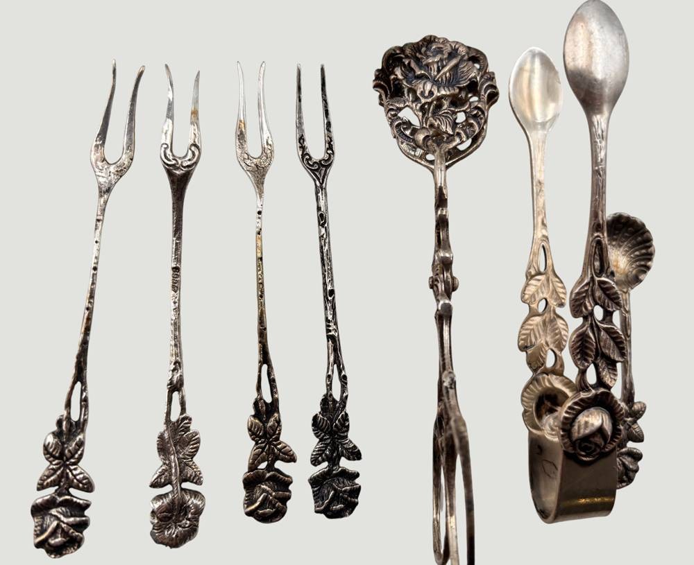 4x Petit Four Gabeln, 1 Salzlöffel, 1 kl. Zange, alle Silber-800-, zus.ca. 40 gr., anbei Zuckerzange versilbert, Rosenmuster [1]