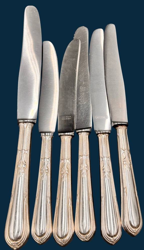 5x kleine, 1 grosses Messer mit Silbergriffen-800- L-24,5 und 21 cm, zus. 380 gr [1]