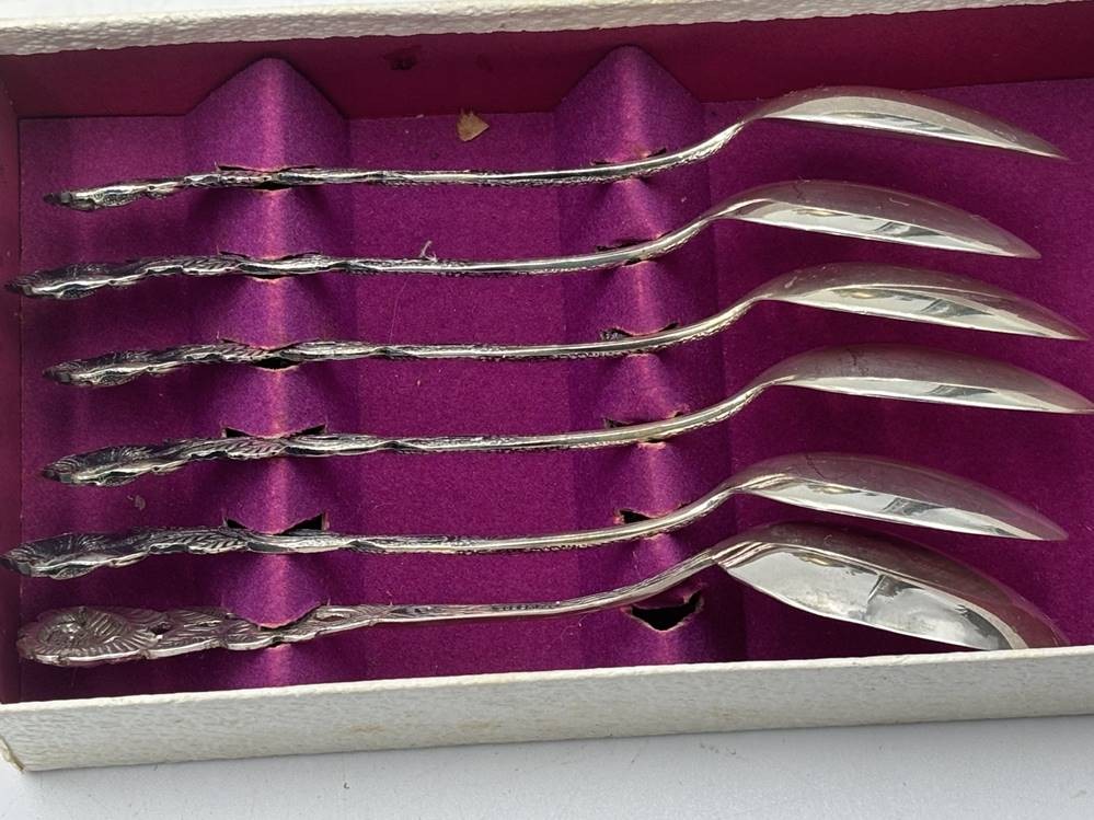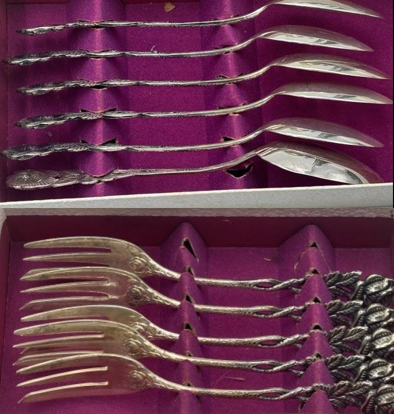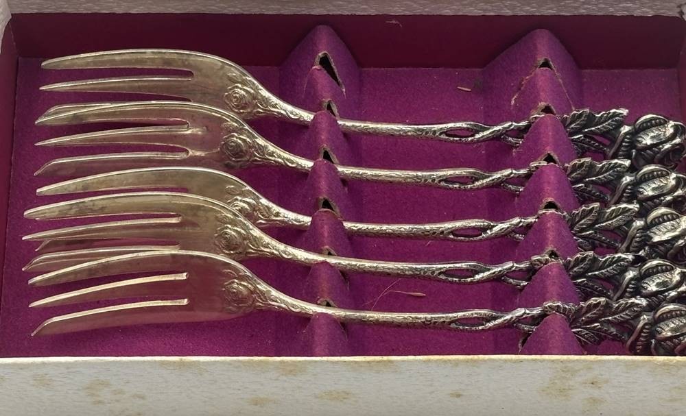 6 Kaffeelöffel, 5x Kuchengabeln, Silber-800-, , L-12 und 14 cm, zus. ca. 210 gr., Hildesheimer Rose