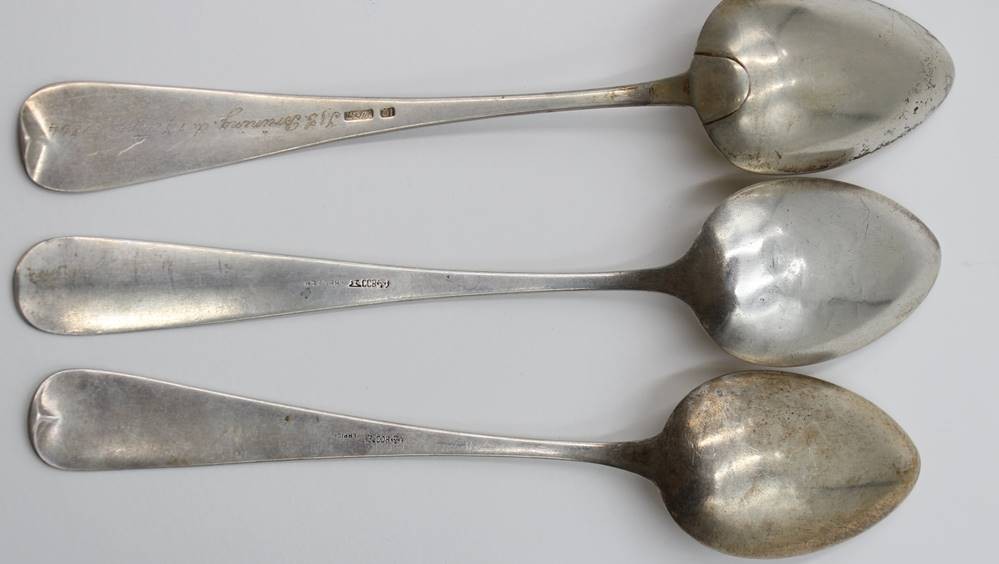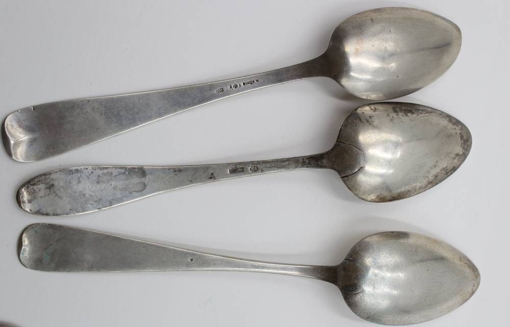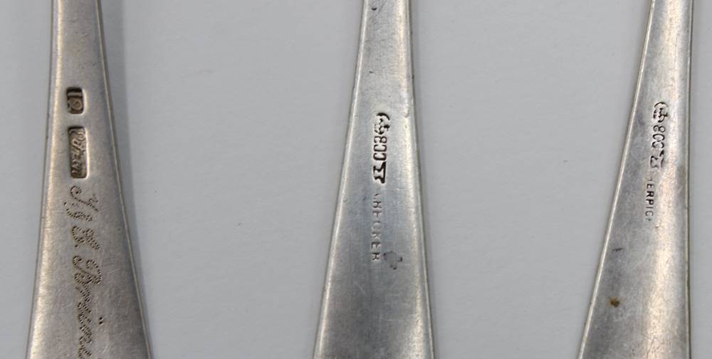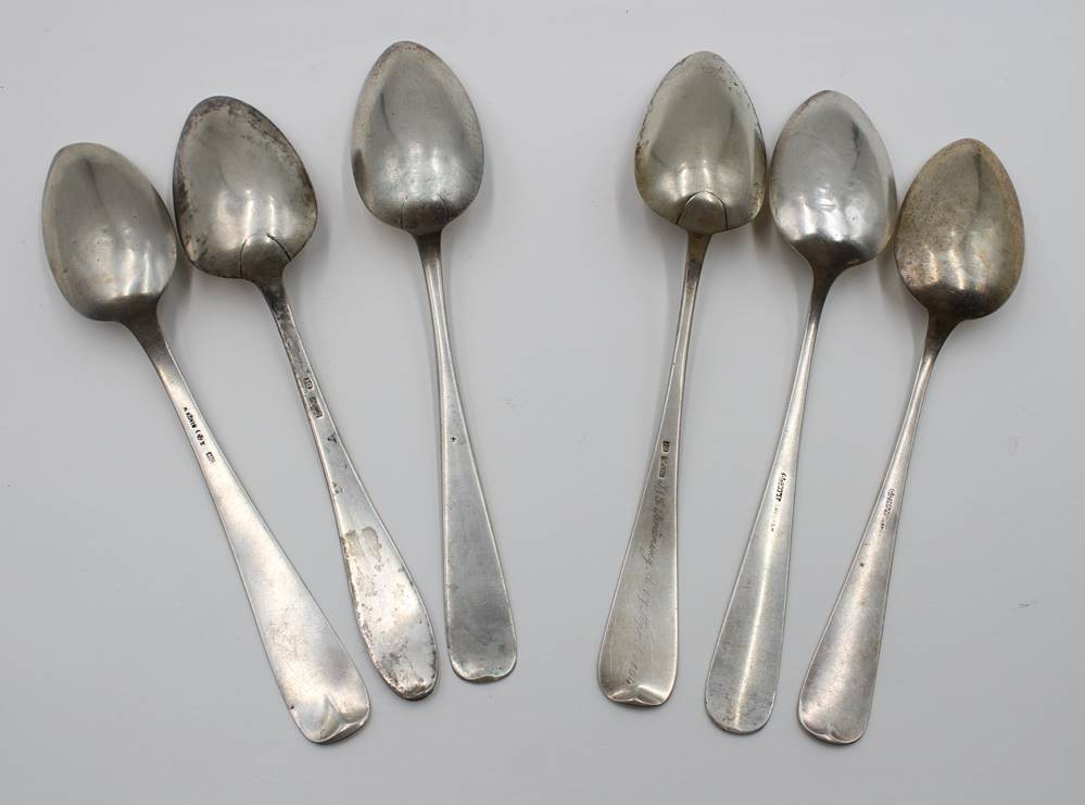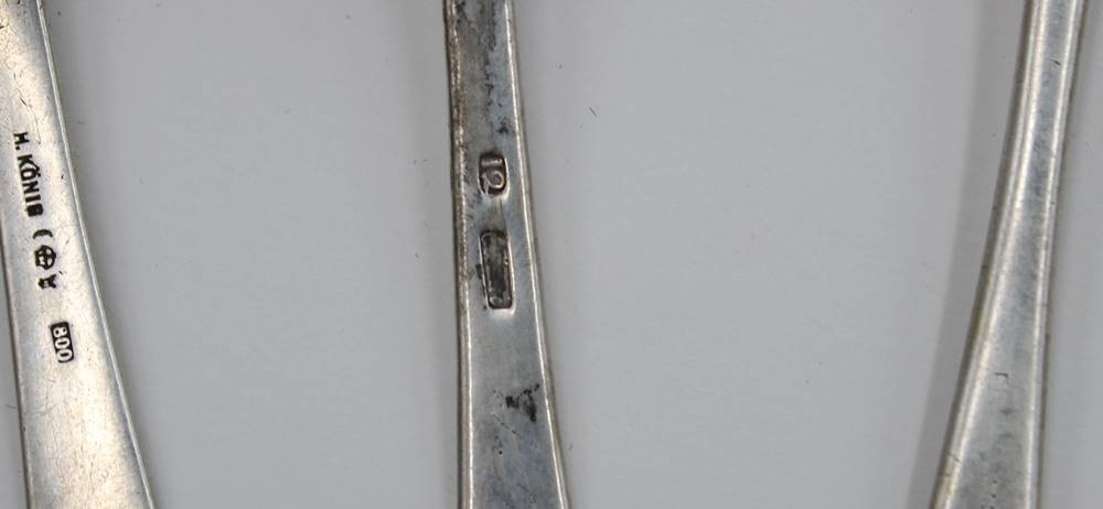6x div. antike Speiselöffel, 800 u. lötiges Silber, teilw. Alters-u. Gebrauchsspuren, zus. ca. 293,9gr., ca. L-22,5cm [1]
