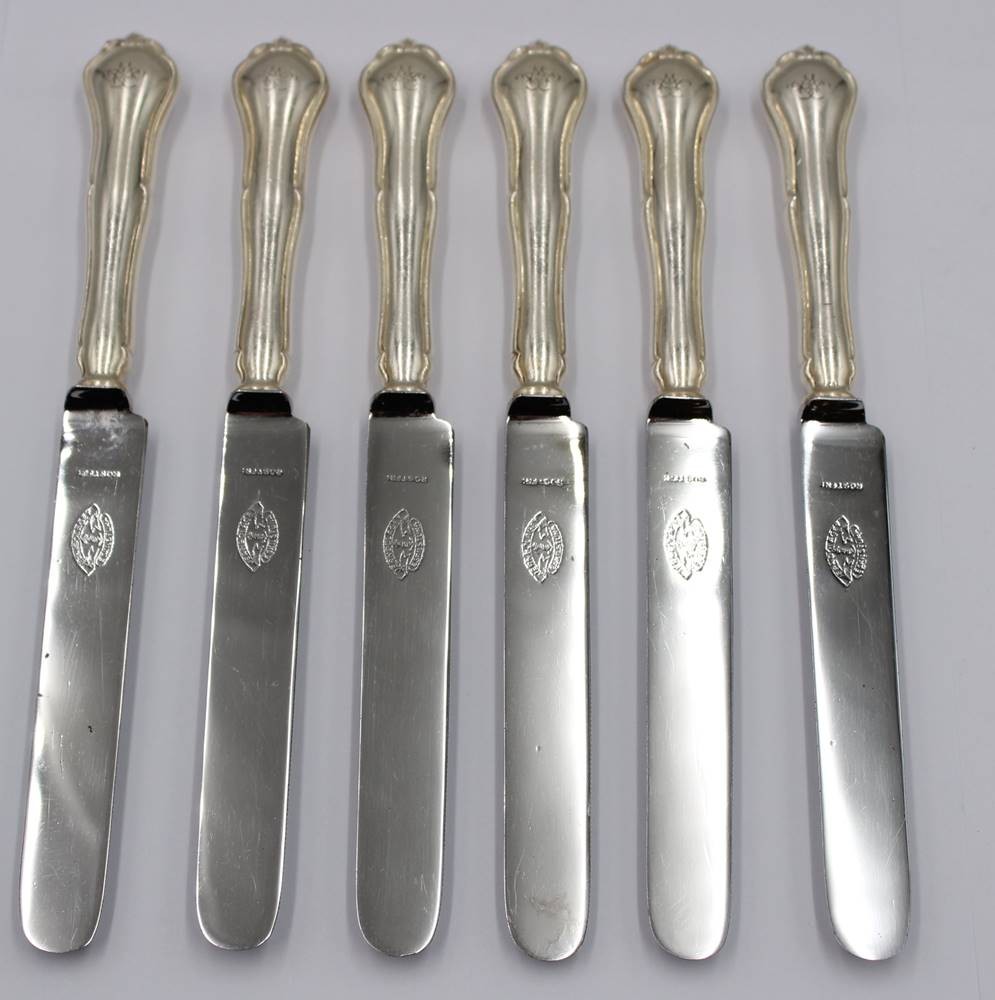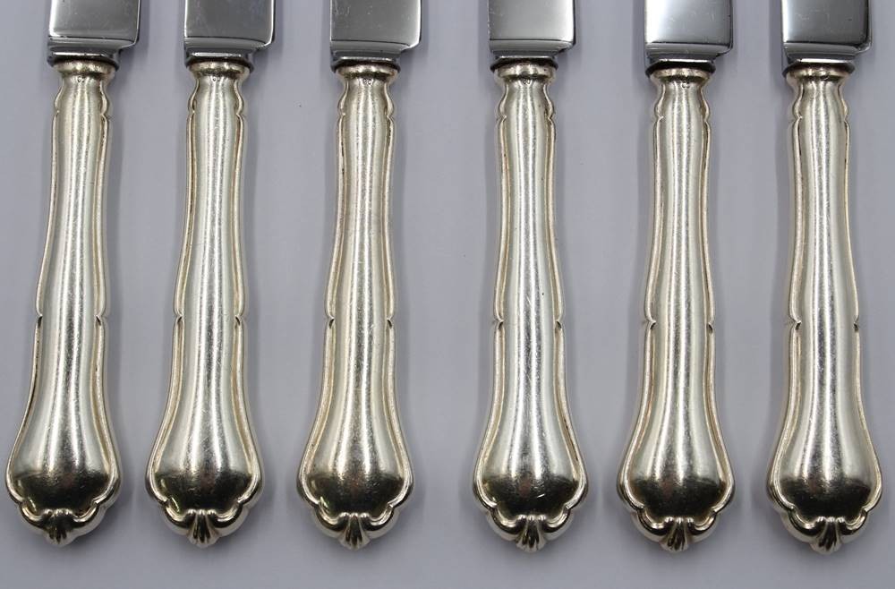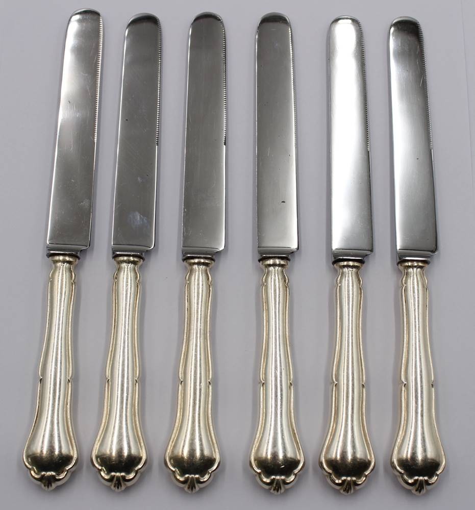 6x gr. Speisemesser, 90er Auflage, älter, ca. L-21,5cm