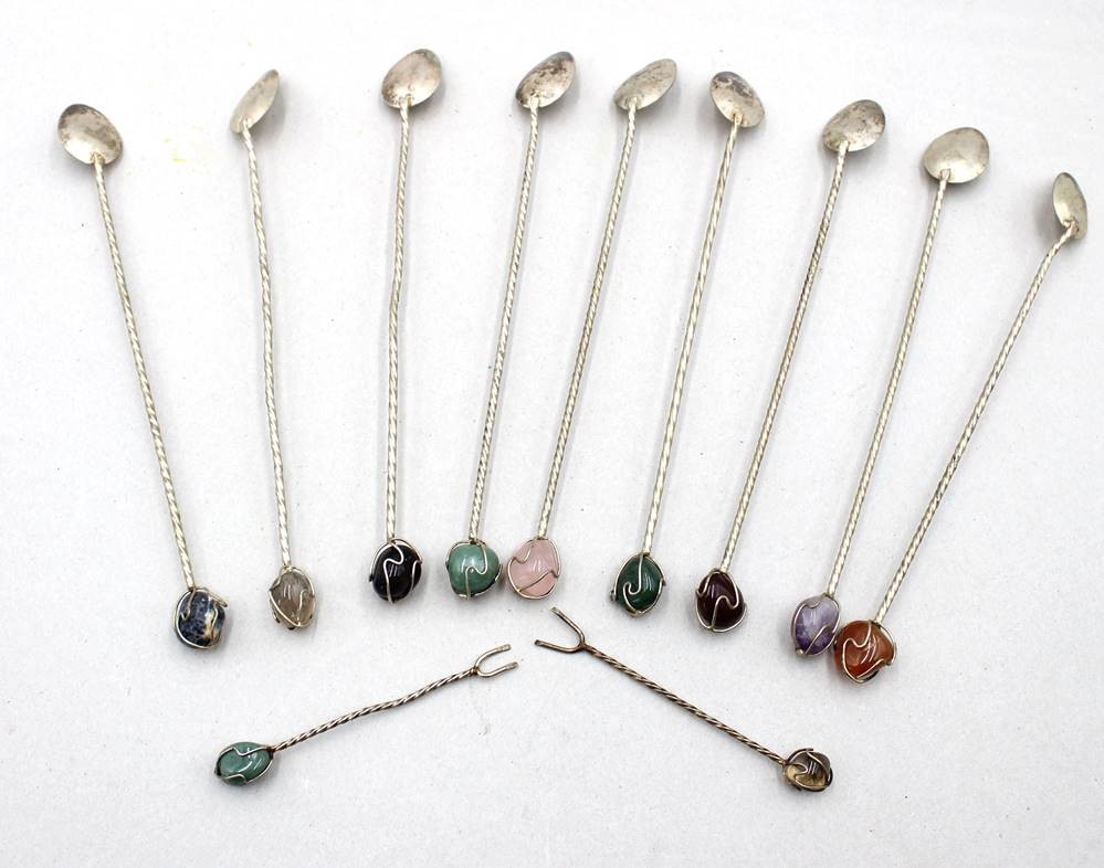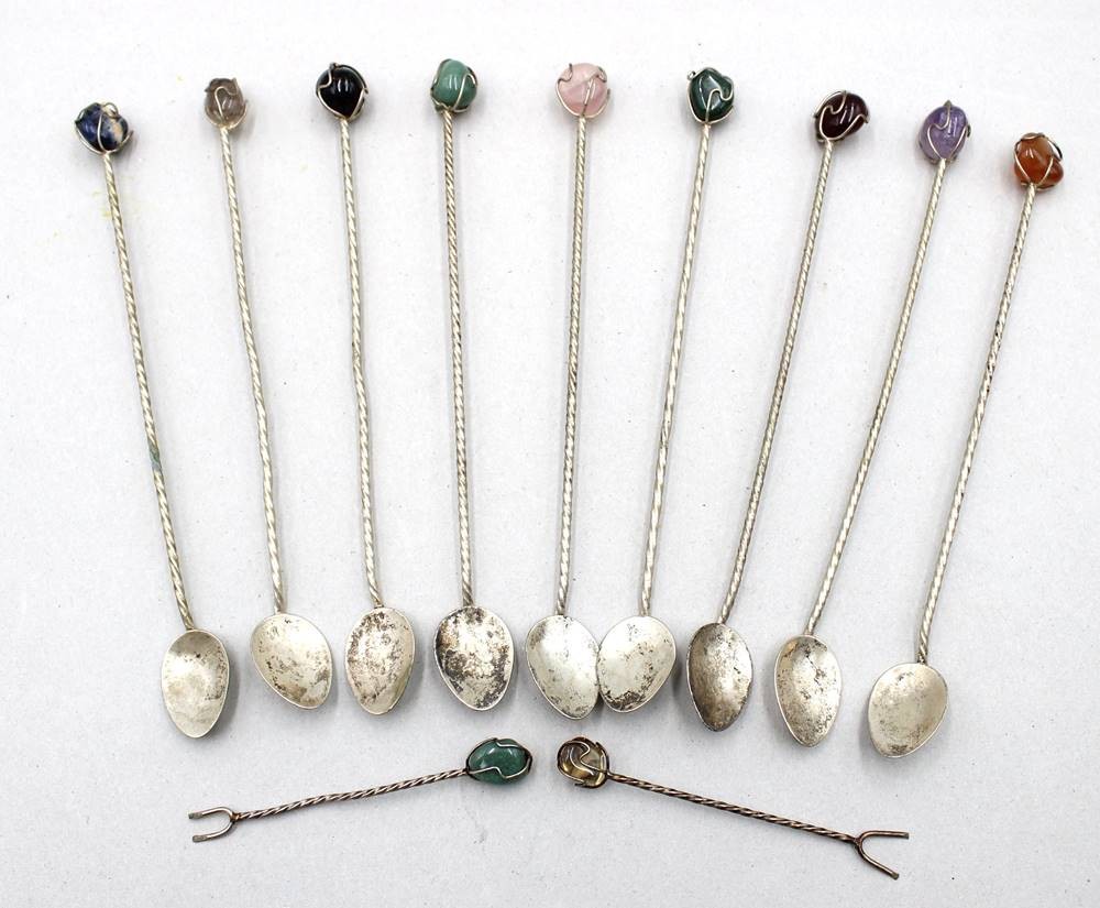 9 Cocktail-Löffel mit Halbedelsteinen sowie 2 kl. Spieße, versilbert, ca. L-19,5cm [1]