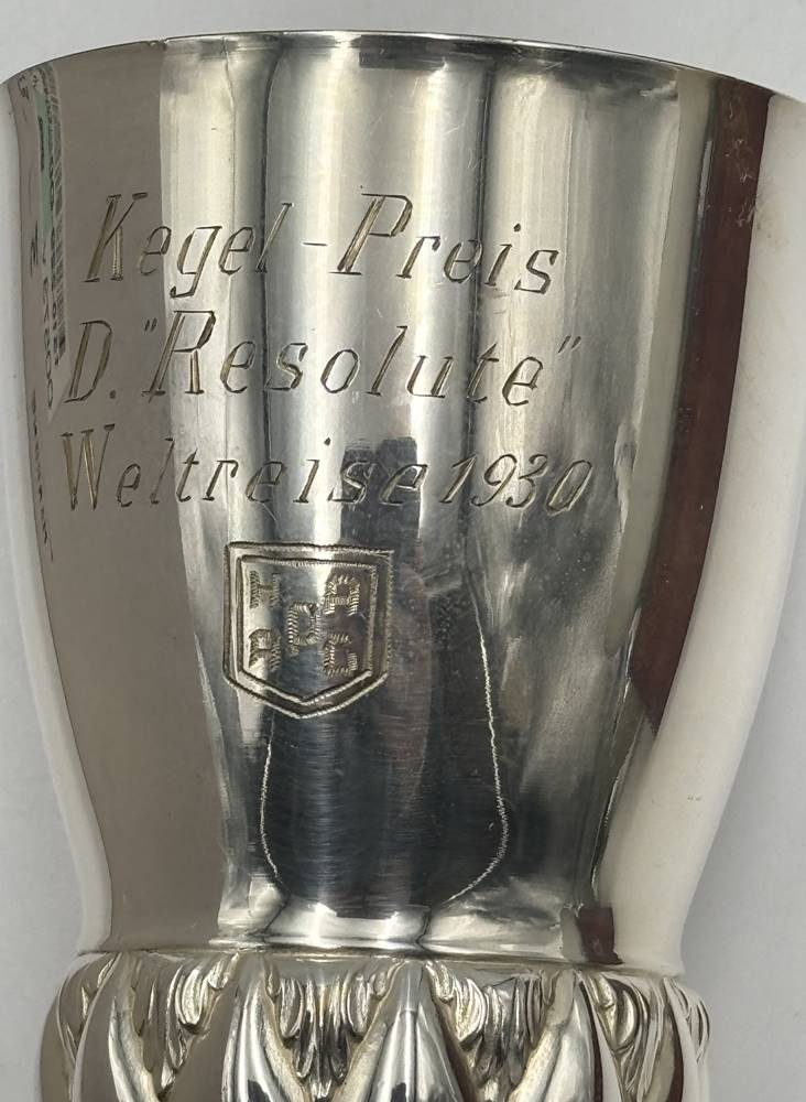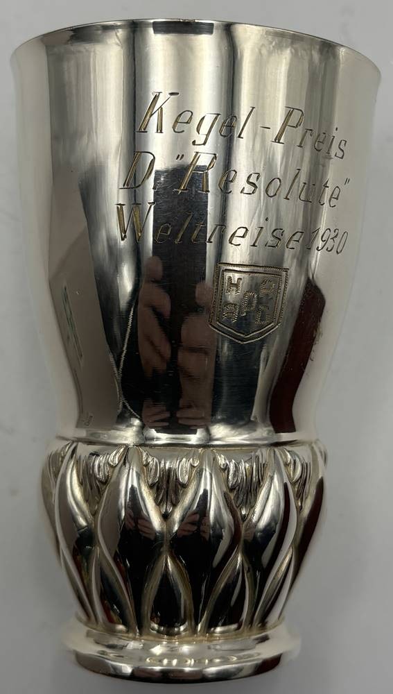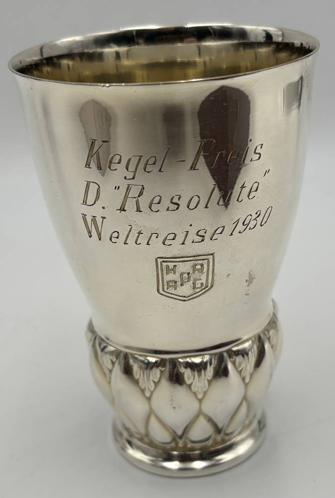 Art Deco Becher "WMF" Straussenmarke mit Logo der "H.A.P.A.G."Kegelpreis an Bord des Dampfers Resolute" 1930 ?? [1]