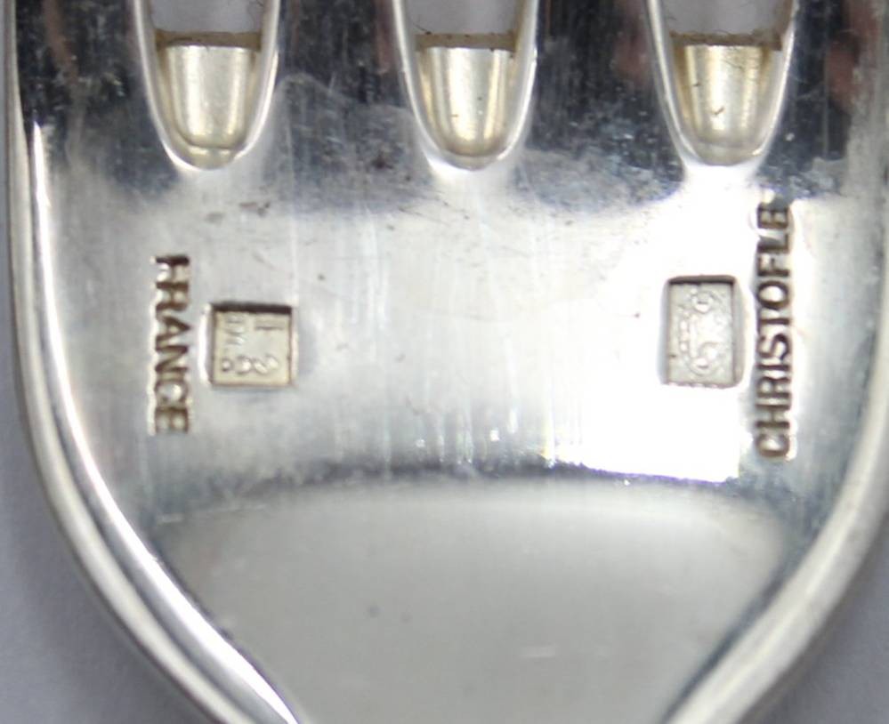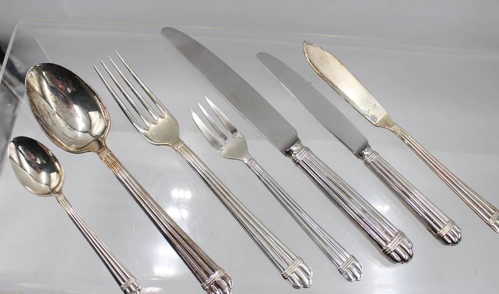 Besteck der Serie Aria von Christofle, versilbert, 15x gr. Messer, 11x Dessertmesser, 8x Fischmesser, 15x Speisegabeln, 12x Kuchengabeln, 8x Suppenlöffel, 8x Kaffeelöffel [1]