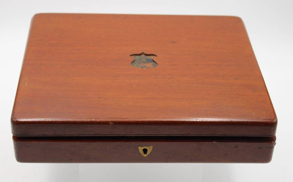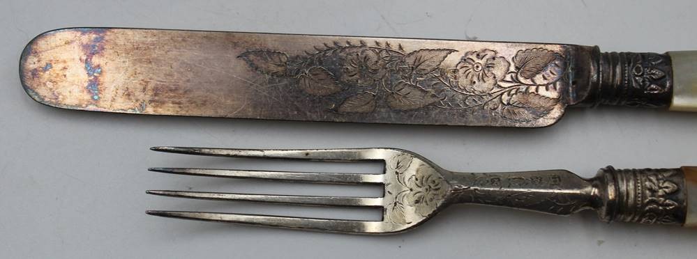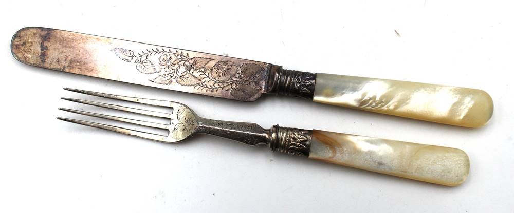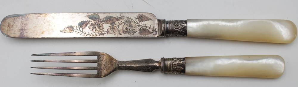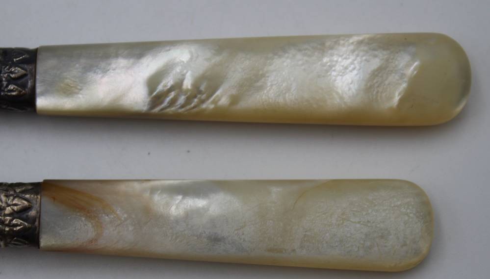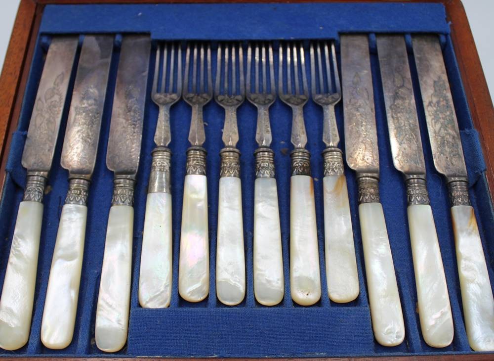 Besteck für 12 Personen in Holzkasten, 19. Jhd., Perlmuttgriffe, Messerklingen ziseliert, versilbert, Kasten mit Altersspuren, Messer L-20,2cm. [1]