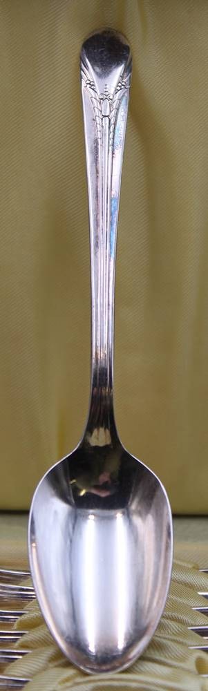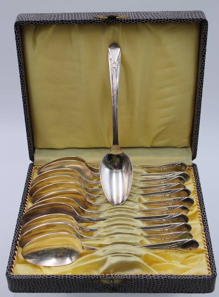 Besteck für 6 Personen, Rogers, versilbert, je 6x Gabeln, Messer, Esslöffel sowie 12x Kaffeelöffel, um 1910/20, Messer L-23cm. [1]
