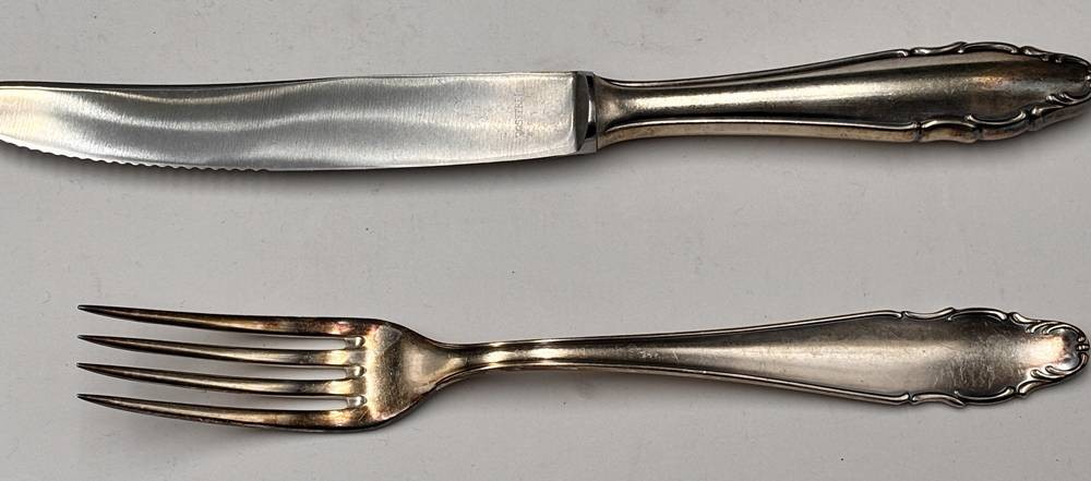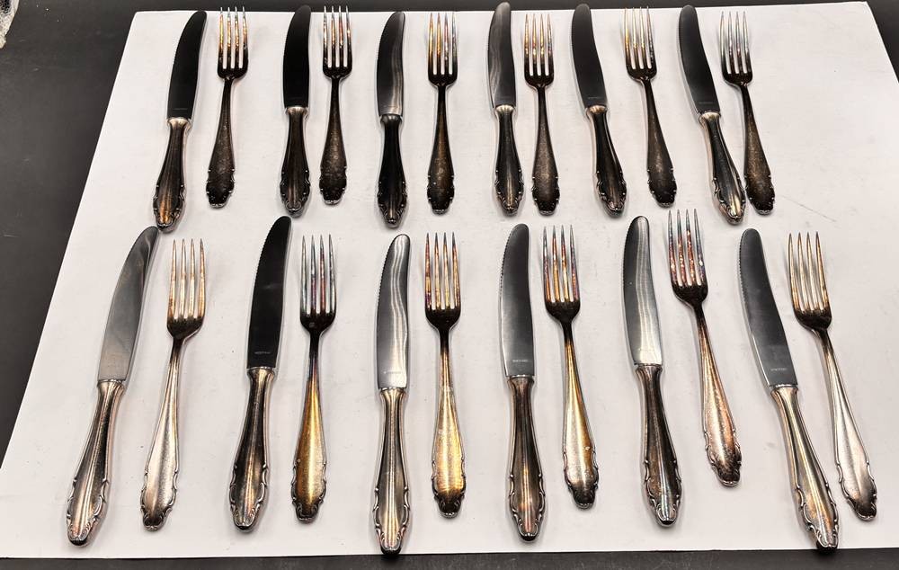 ca. 90 tg. versilbertes Besteck, zus. ca. 5,8 kg, 90-er Auflage, div. Vorlegeteile, 1x Restkasten, 1x in Besteckrolle [1]