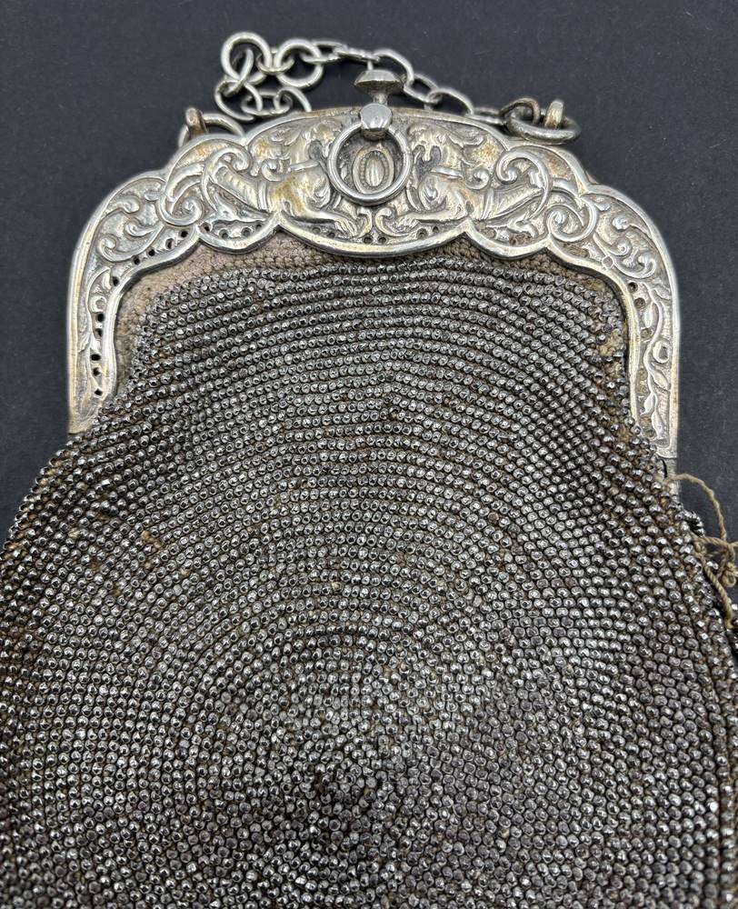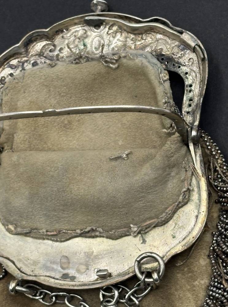 Damenhandtasche mit massiven Silberbügel, div. ungedeutete Punzen, Bügel ca. 170 gr., gesamt, ca. 240 gr, Stoff eingerissen [1]