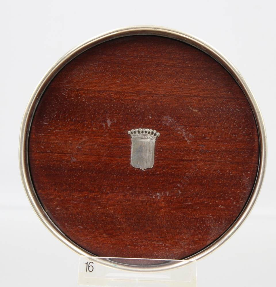 Flaschenuntersetzer, 800er Silber, Holzboden mit Silberwappen, Silber ca. 65gr. , D-12,5cm