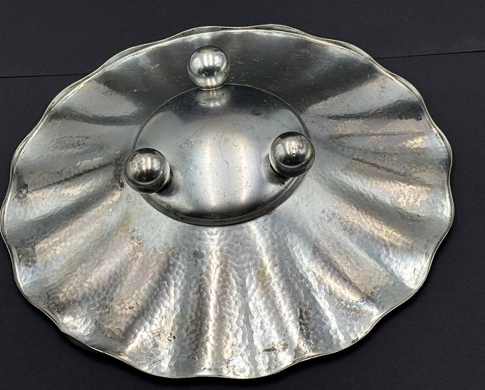 gr. Art Deko Schale, plated, auf drei Kugelfüsschen, H-6 cm, 26 cm, Hammerschlagdekor, guter Zustand [1]