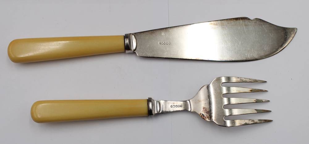 gr. Fischvorleger-Set in Etui, plated mit Bein?-Griffen, Messer L-27 cm, gut erhalten, ungeputzt, Etui Schliessen tw. defekt [1]