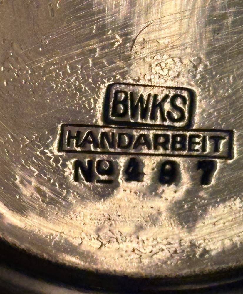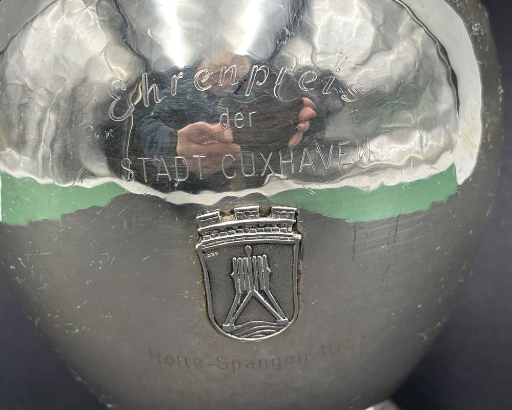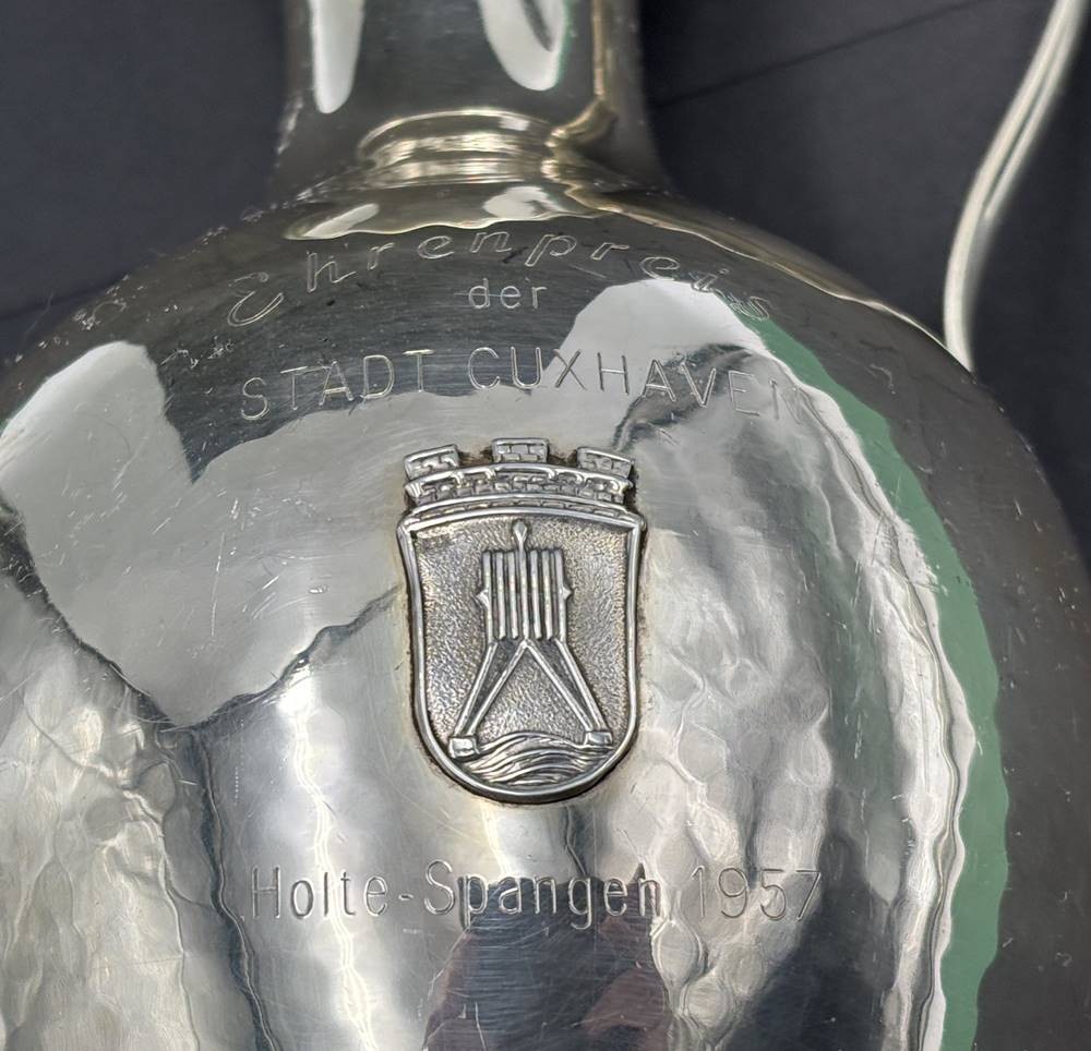 gr. plated Weinkanne "BWSK" Handarbeit, Ehrenpreis der Stadt Cuxhaven 1957, wohl Reitpreis, H-24 cm, Rückseitig 2 Dellen, 243 gr. [1]