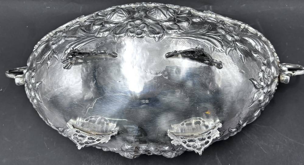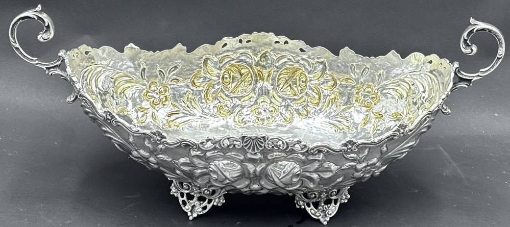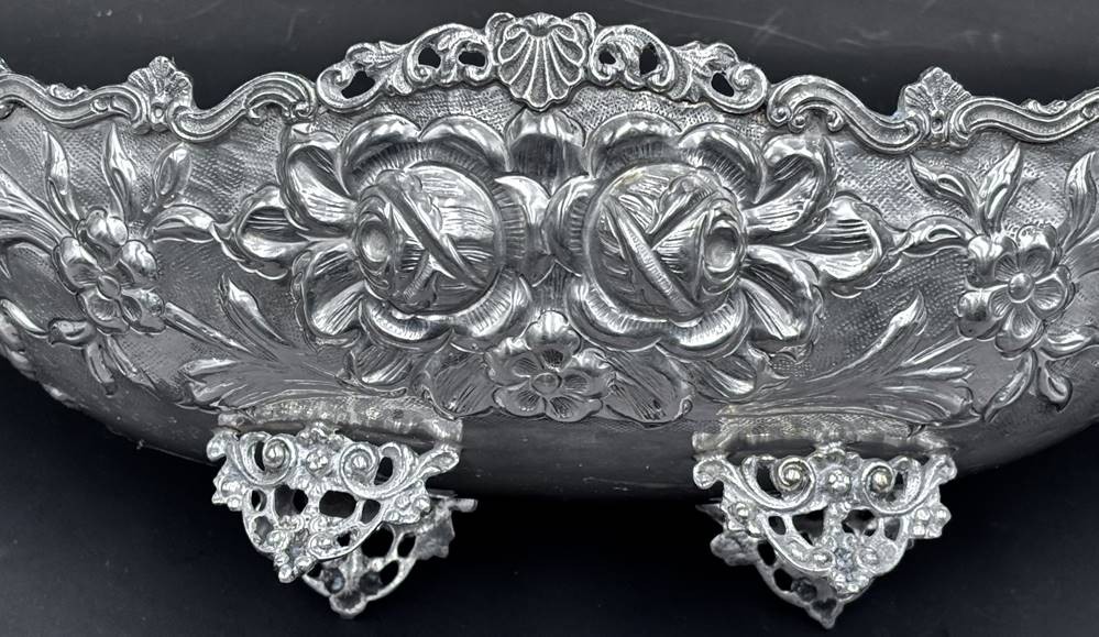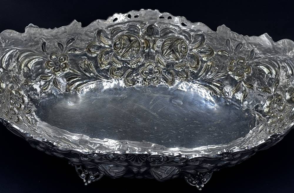 grosse ovale Silberschale-800-, Durchbruchrand mit Blumenmuster, H-11 cm, L-38 cm, 17 cm, 639 gr. [1]