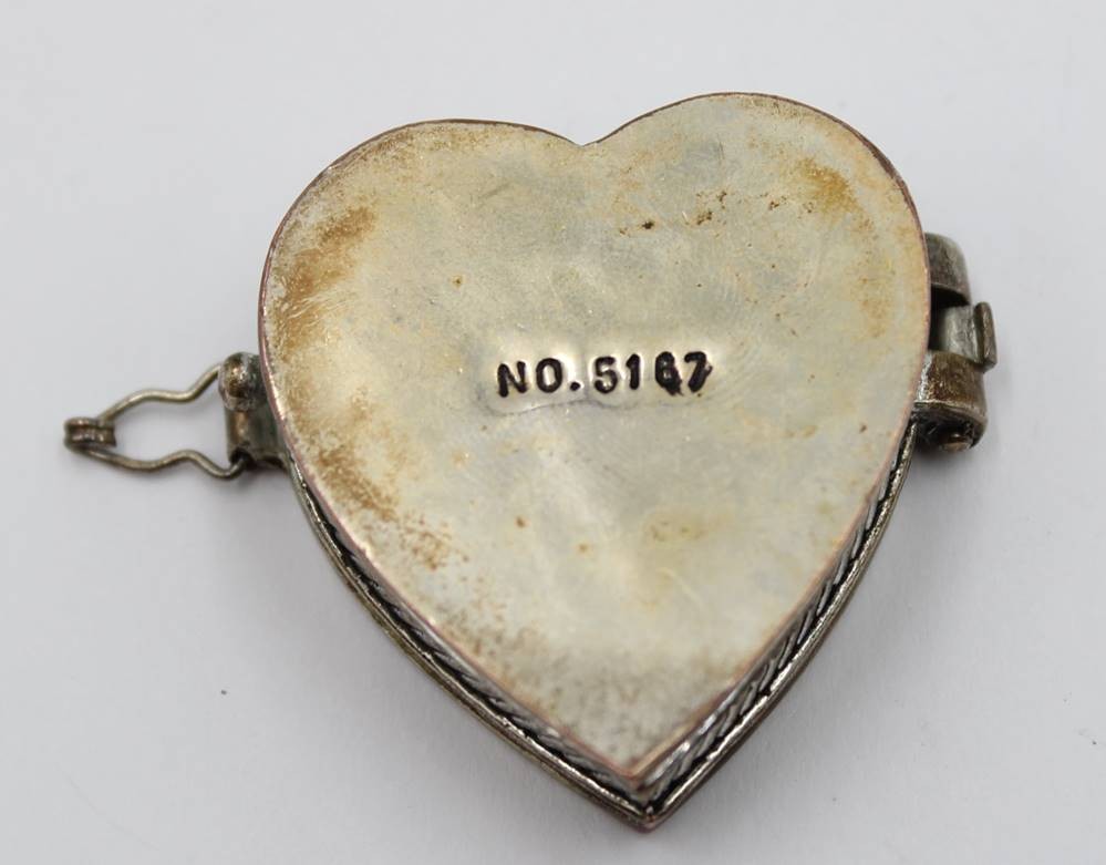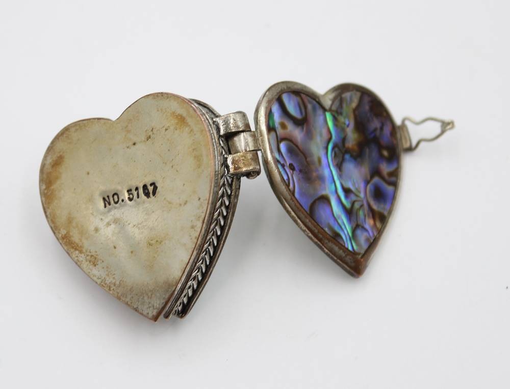 herzförmige Pillendose, Kupfer versilbert (berieben), Deckel mit Abalone-Muschel, ca. 3,5 x 4cm [1]