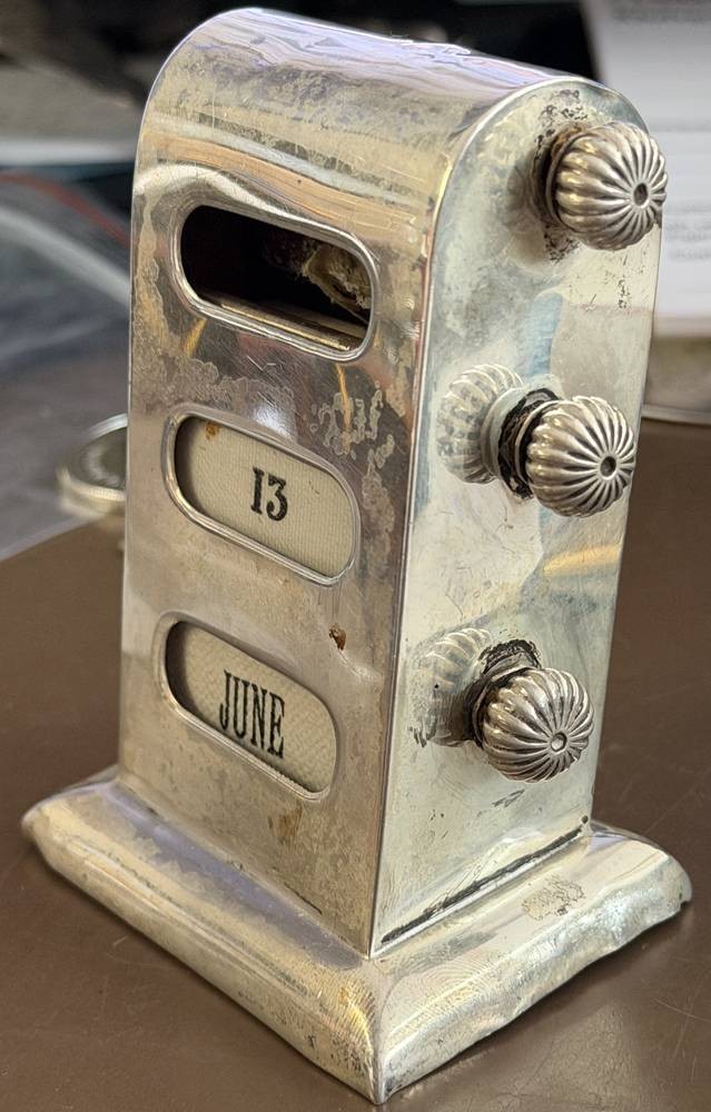 Immerwährender Tischkalender in Silbergehäuse-925-, , verschlagene Punzen, Stand etwas verdellt, H-9,5 cm, 7x4,5 cm, 148 gr [1]