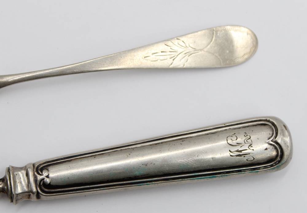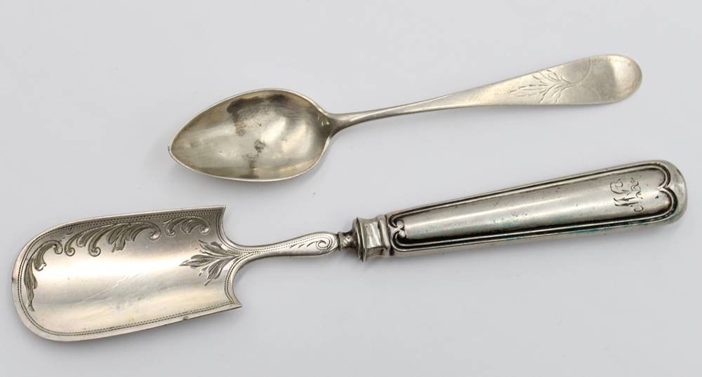 Kaffeelöffel und kl. Heber, je 12lötiges Silber, 1x Punktgravur und 1x Ziermonogramm, ca. 13 und 17,3cm