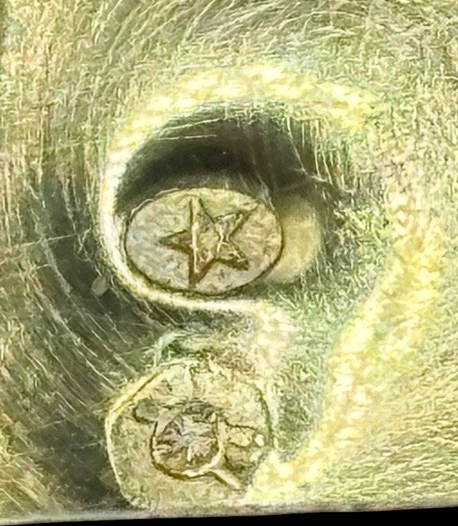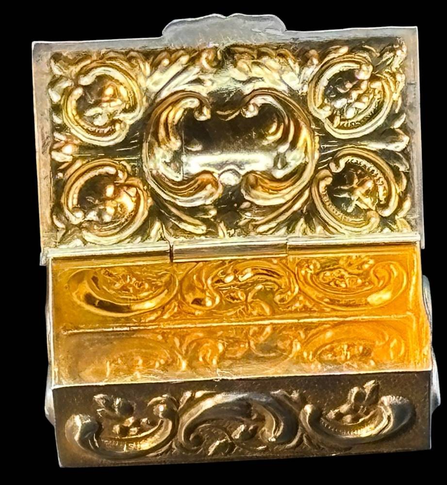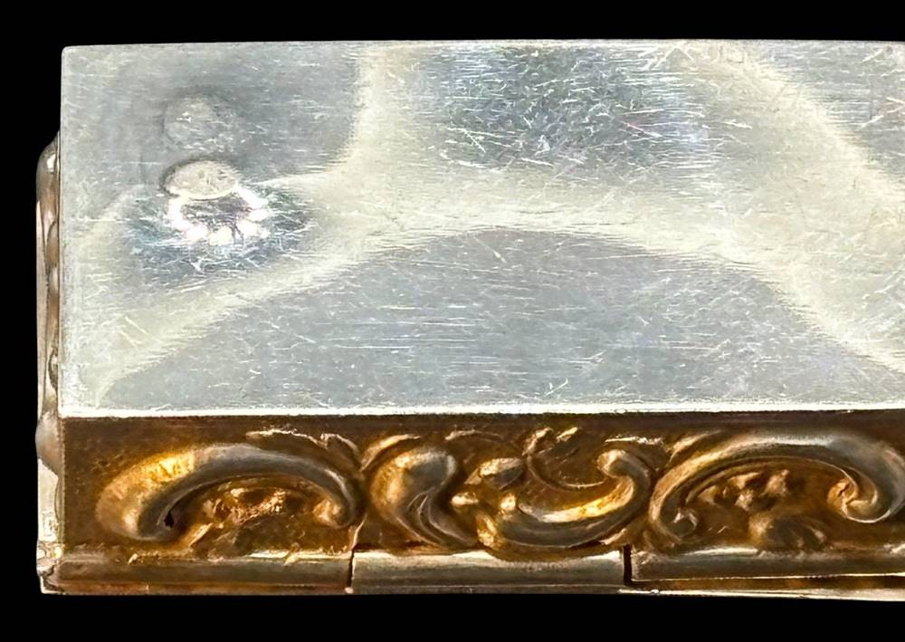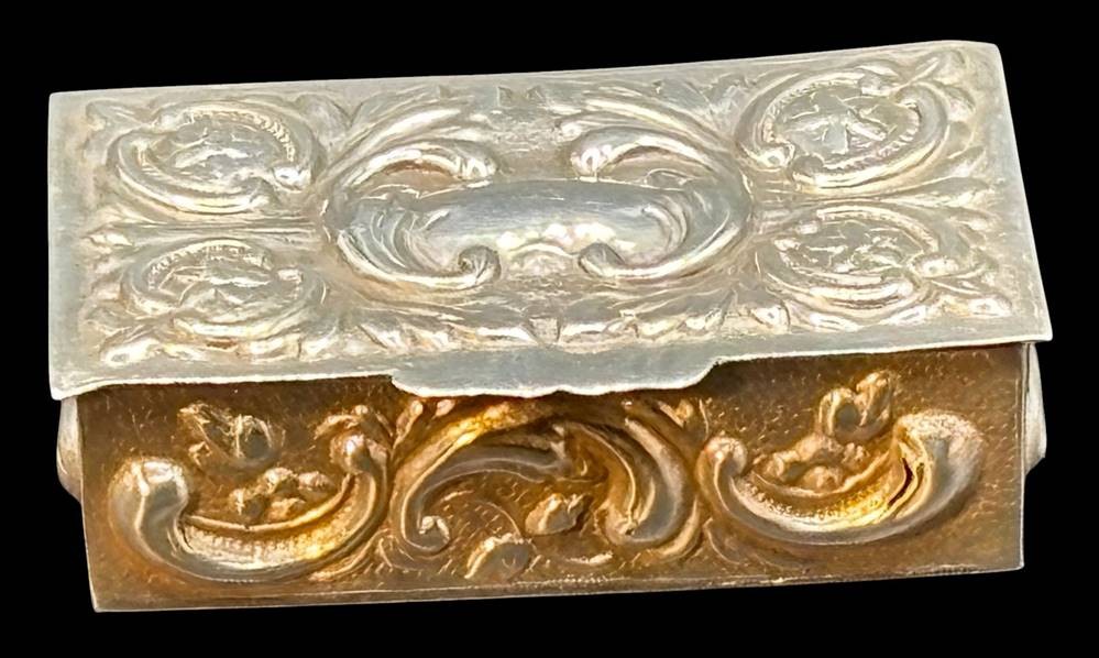 kl. Pillendose, Silber, innen vergoldet, 2 unged. Punzen, wohl UDSSR?, H-1,3 cm, ca. 4,5x2,5 cm, 12 gr [1]
