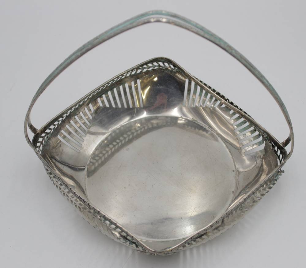 Korbschale, 800er Silber, stark beschädigt, 275gr., auf Medaillons Gravuren, ca. H-17cm. [1]