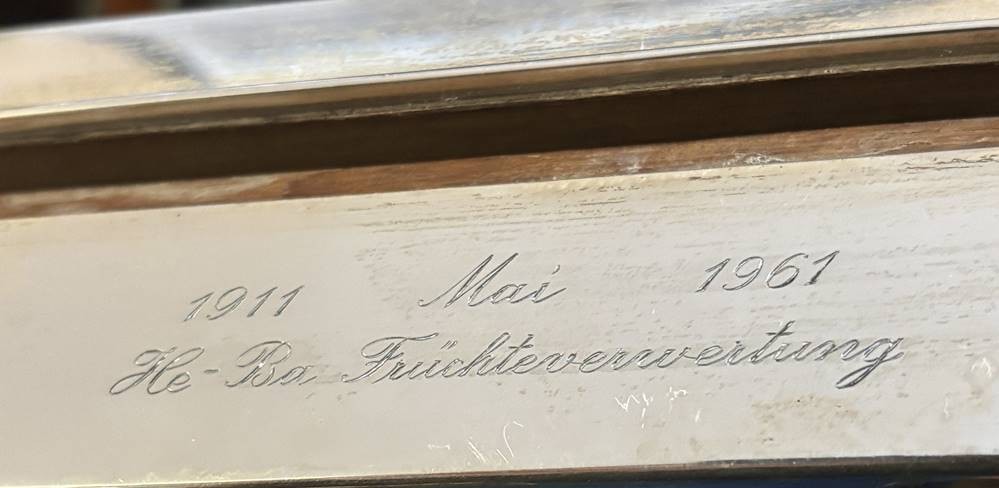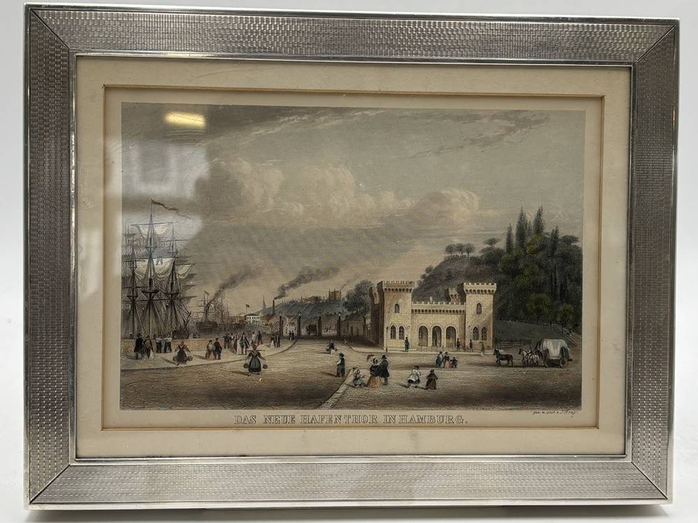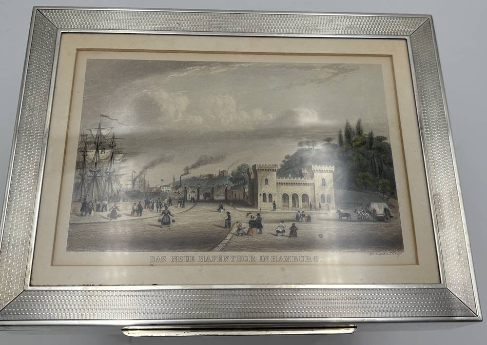 massiver schwerer Zigarrenkasten, Silber-925- mit leichten Holz ausgeschlagen, mit Widmung vorne, 1084 gr., 17x23 cm, Deckel mit Hamburg-Ansicht-Das neue Hafenthor um 1850− [1]