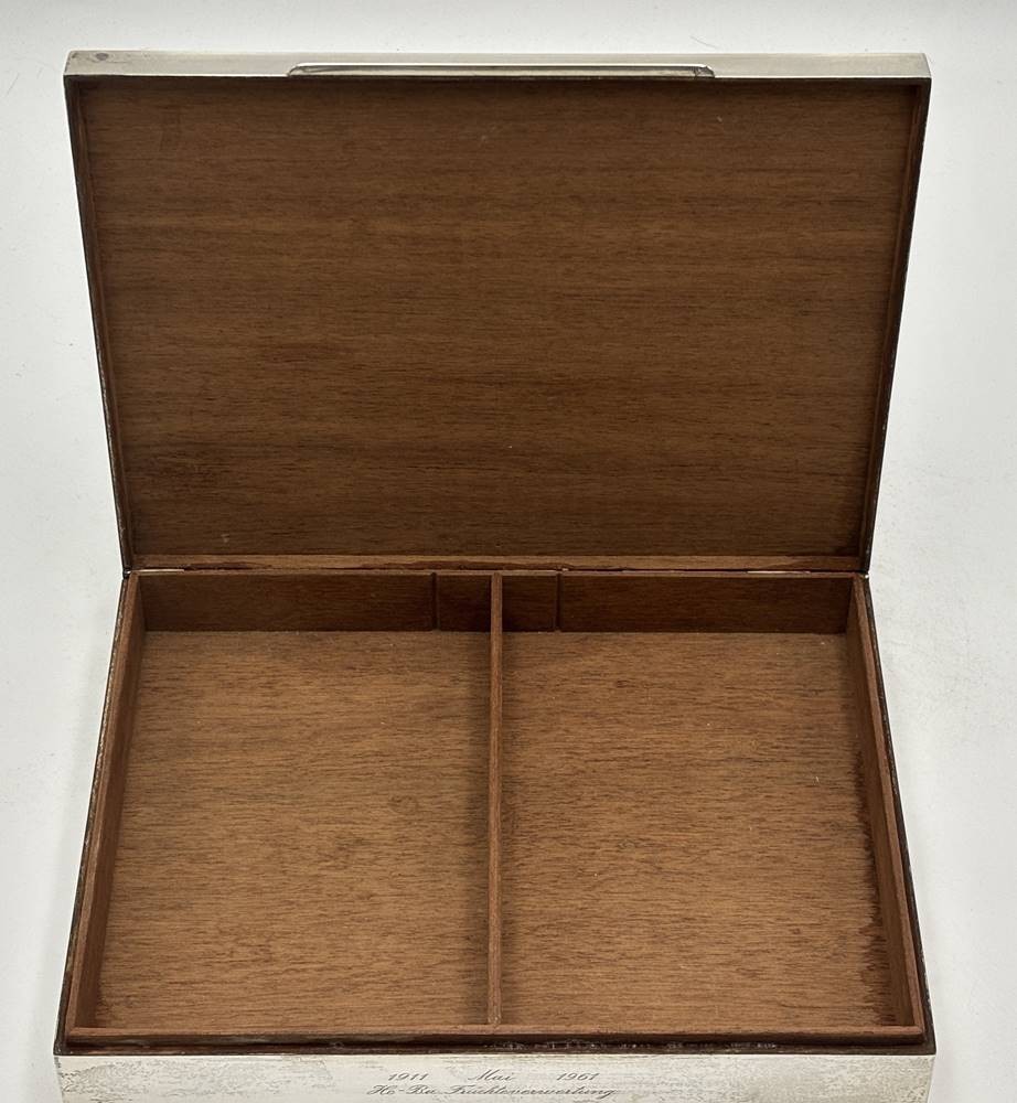 massiver schwerer Zigarrenkasten, Silber-925- mit leichten Holz ausgeschlagen, mit Widmung vorne, 1084 gr., 17x23 cm, Deckel mit Hamburg-Ansicht-Das neue Hafenthor um 1850−