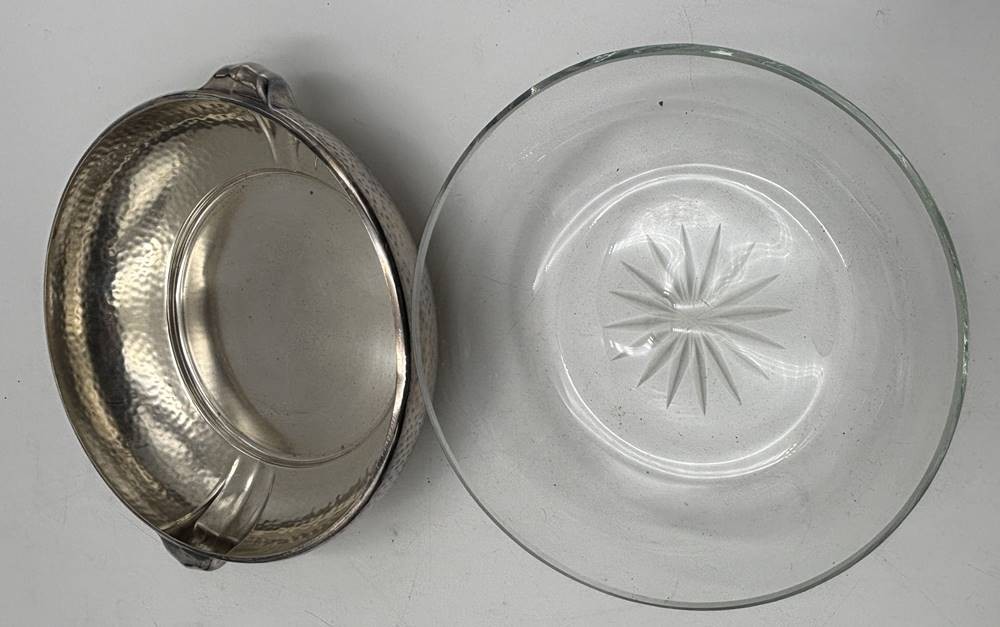 plated Schale mit Kr4istall-Einsatz "Quist" Hammerschlagdekor, H-6 cm, D-ca. 23 cm, guter Zustand [1]