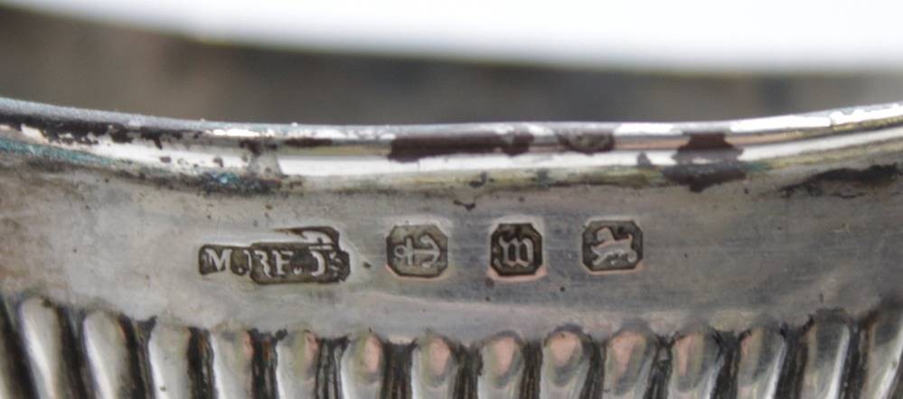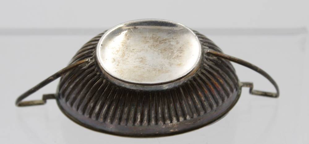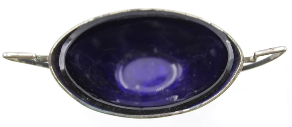 Saliere, England, Sterling, blauer Glaseinsatz, Alters-u-Gebrauchsspuren, ohne Glas 28gr., H-4cm B-10cm. [1]