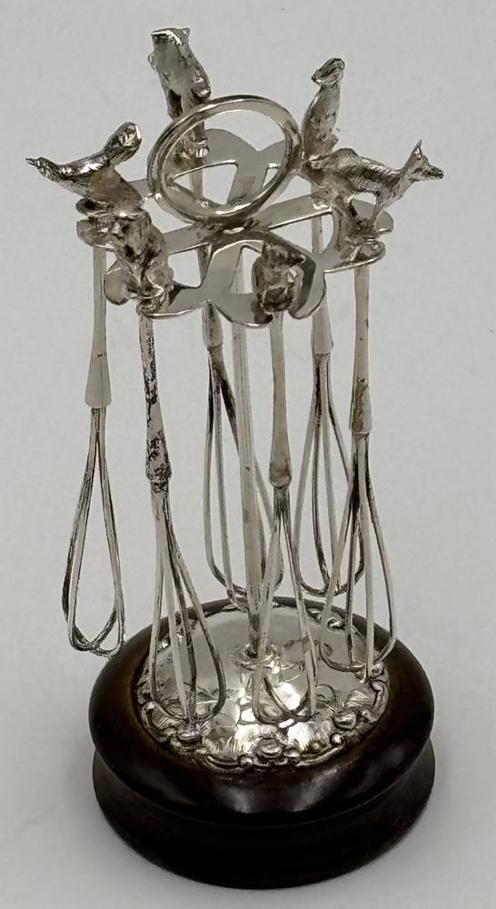 Ständer mit 6 Champagner-Quirle, Silber-800-, alle mit div. Tierfiguren, Holzstand [1]