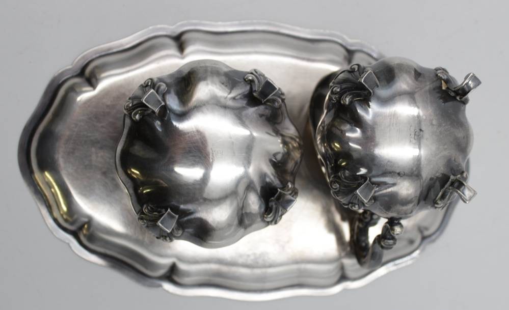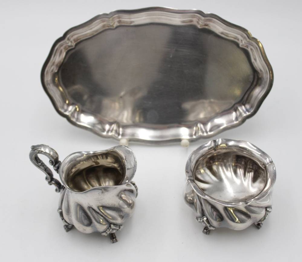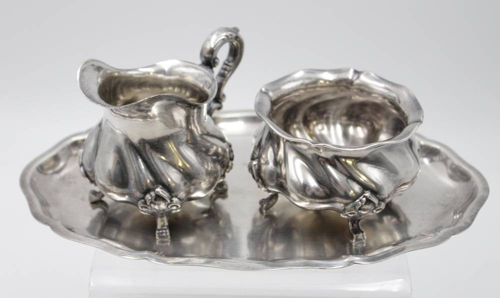 Tablett mit Milch und Zucker, Alpaka, Gebr. Deyle, ca. H-8cm, Tablett 24,3 x 14,8cm. [1]