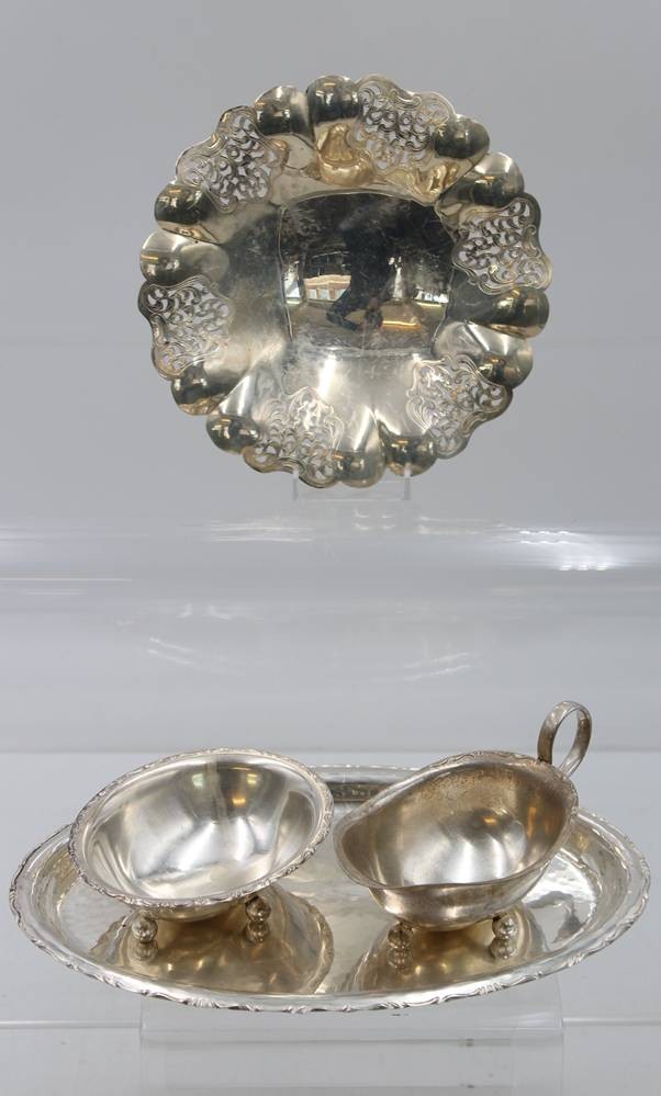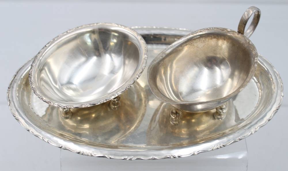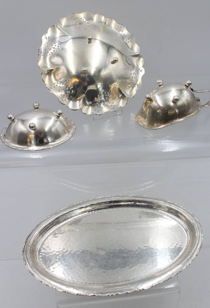 Tablett mit Milch und Zucker sowie kl. Schale, versilbert, ca. H-6cm, Schale D-17cm [1]