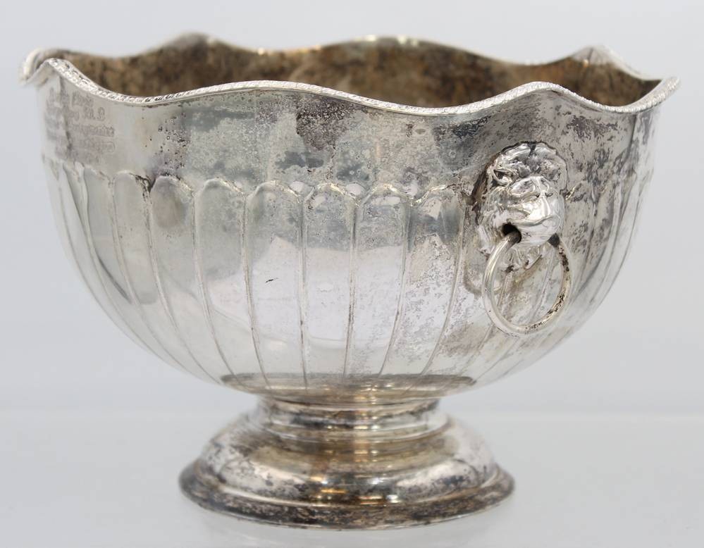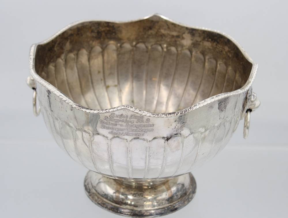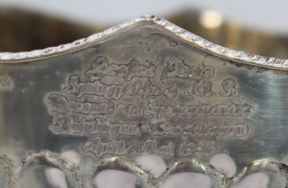 Tafelaufsatz, England, versilbert, Vorderseite mit Gravur, Reitpreis, ca. H-15cm, D-22cm [1]