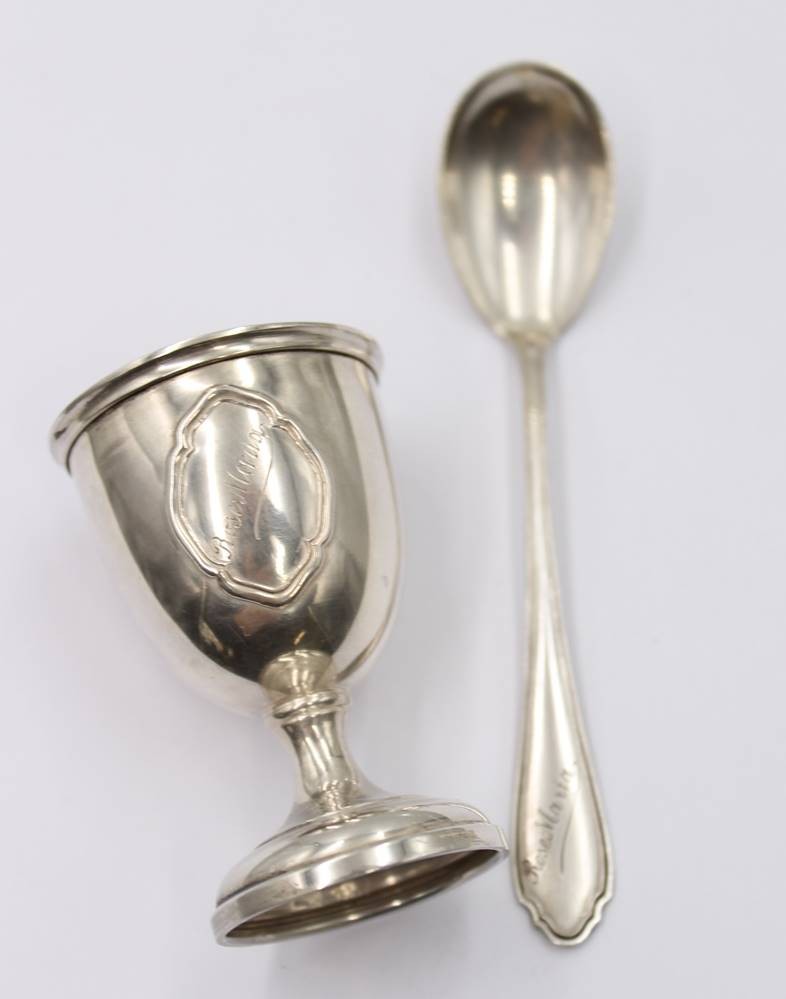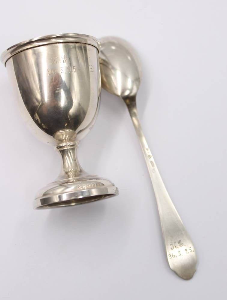 Taufgeschenk, Eierbecher und Löffel, 800er Silber, Gravur "Rosemaria", datiert 1925, in Kasten (riecht streng)