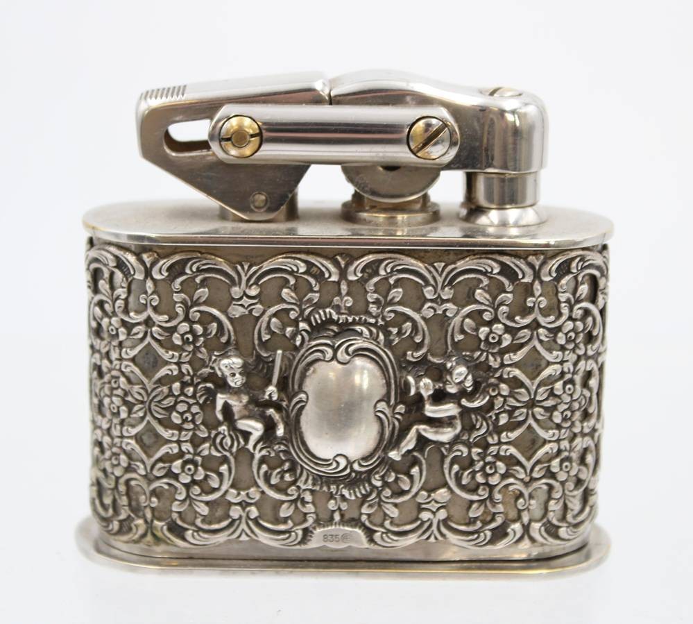 Tischfeuerzeug, Karl Wieden, aufwendig verzierte Hülle aus 835er Silber, komplett 300gr., H-7,5cm B-8,5cm