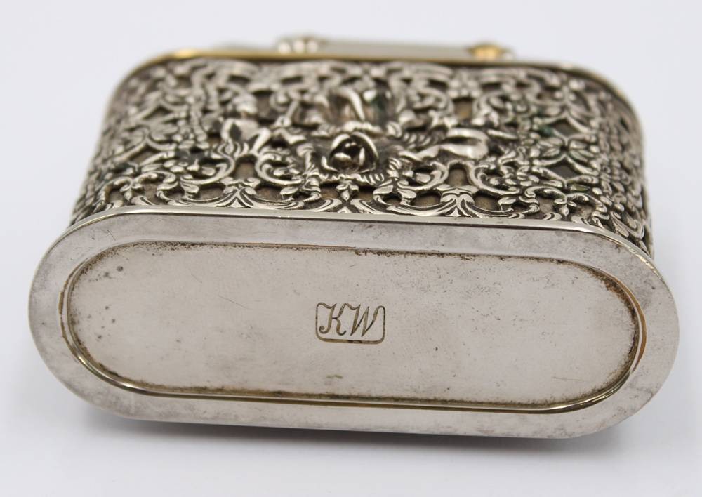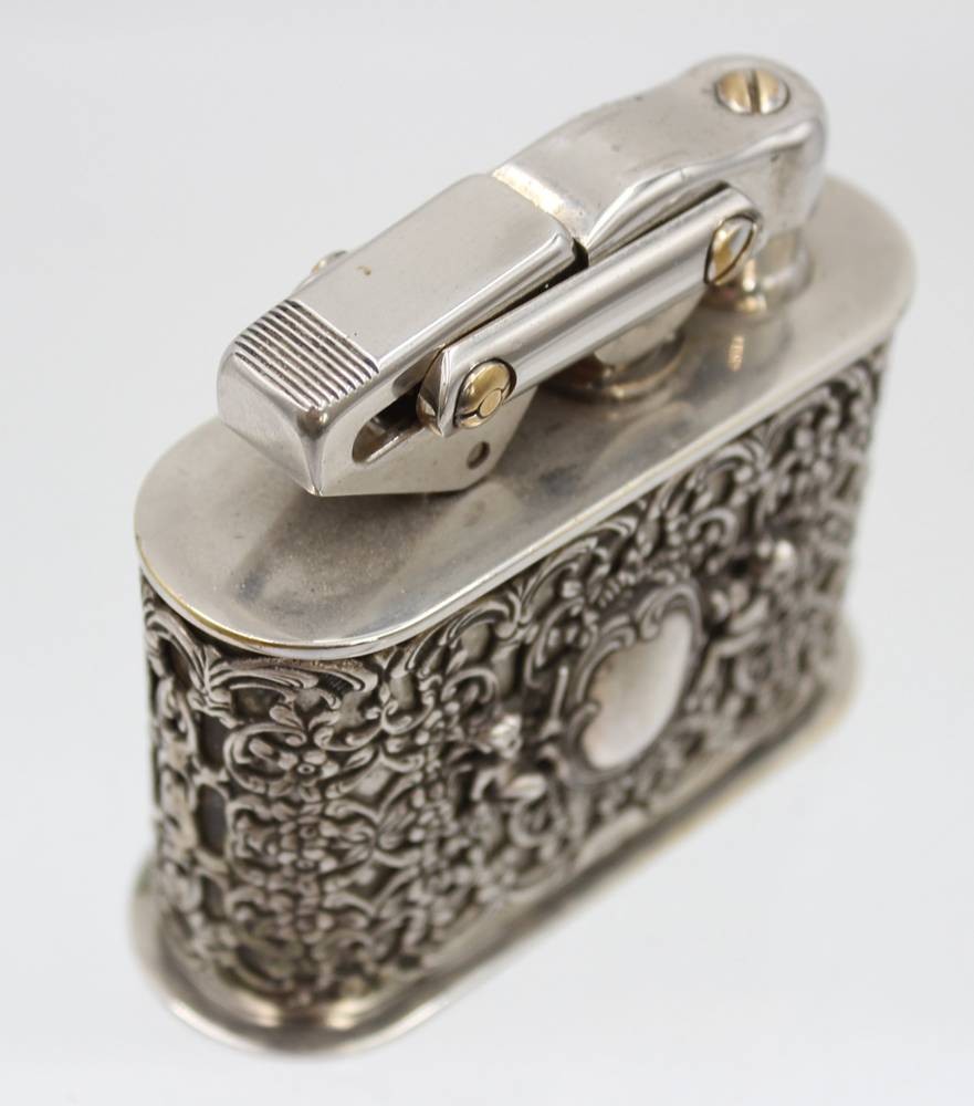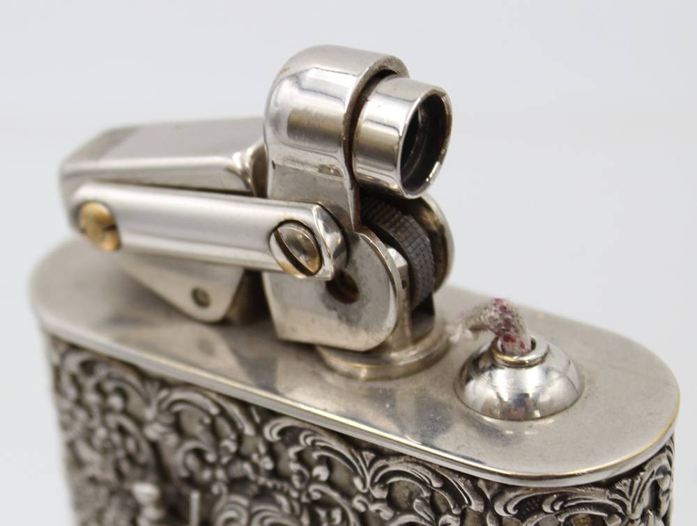 Tischfeuerzeug, Karl Wieden, aufwendig verzierte Hülle aus 835er Silber, komplett 300gr., H-7,5cm B-8,5cm [1]