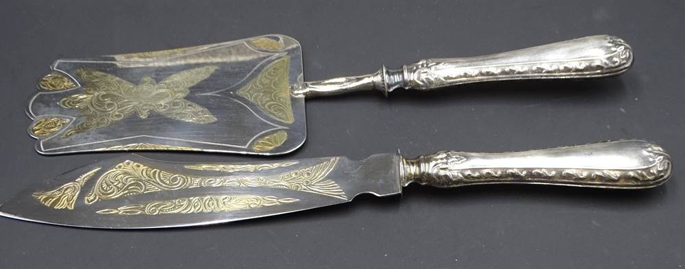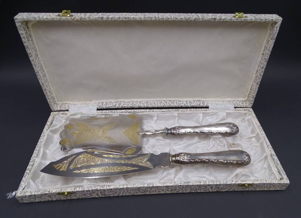 Tortenmesser und Heber, versilbert, teilw. vergoldet, in Etui, ca. L-26cm [1]