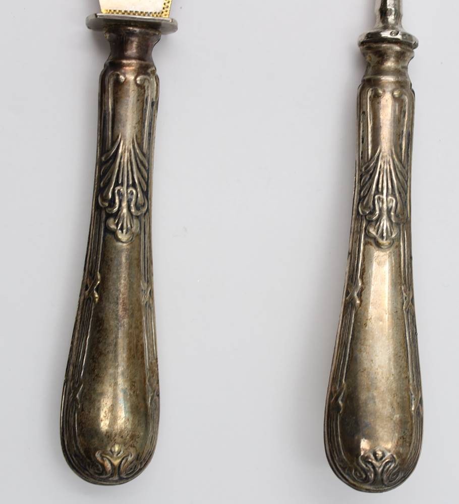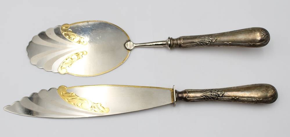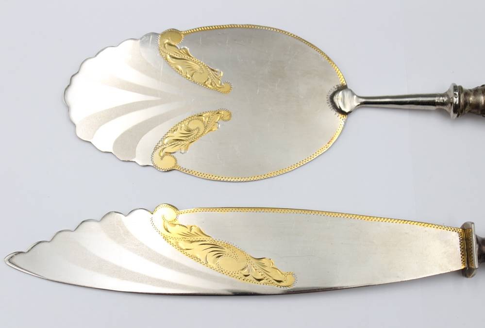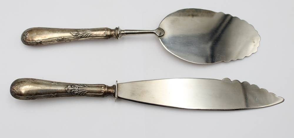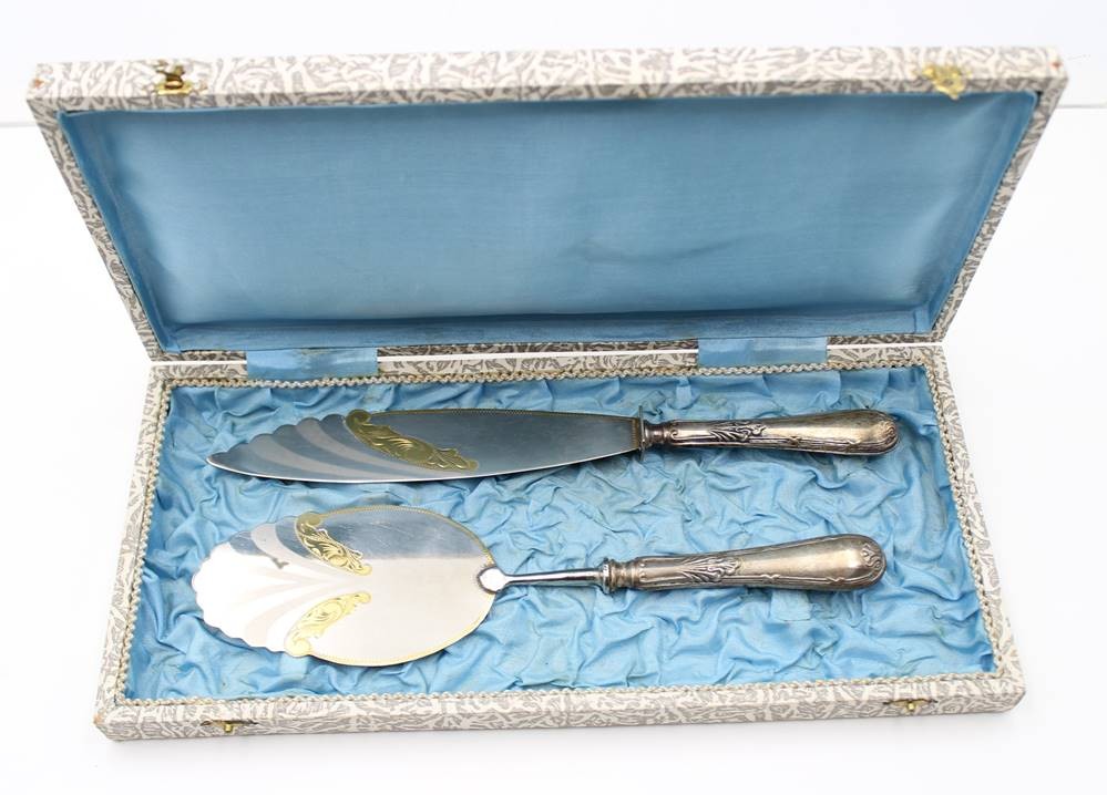 Tortenmesser und Tortenheber, in Kasten, versilbert, ca. L-28,5cm [1]