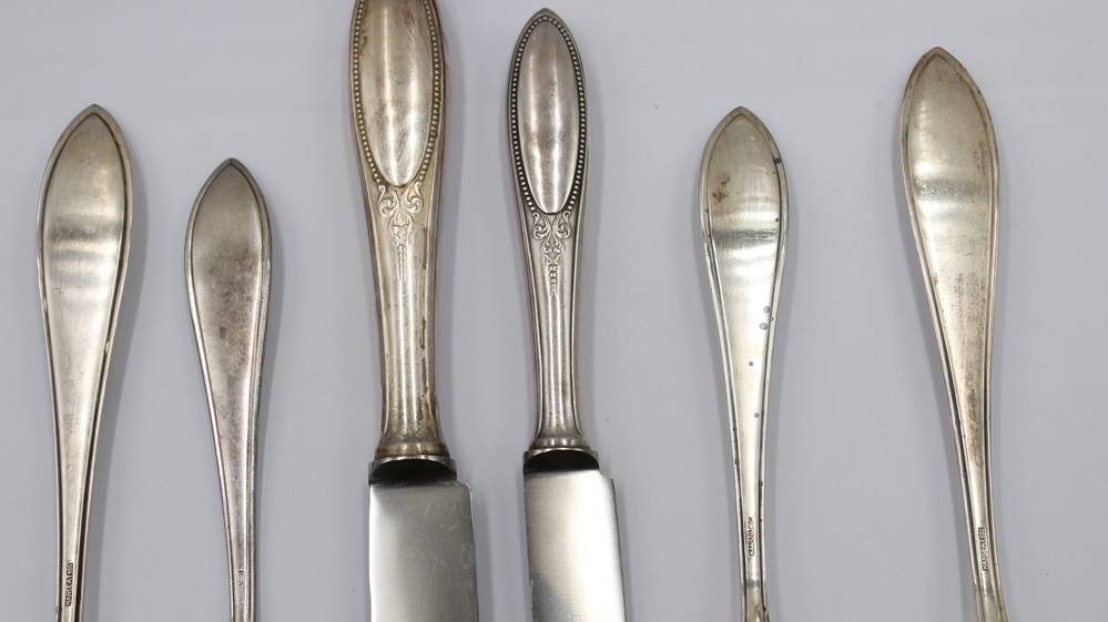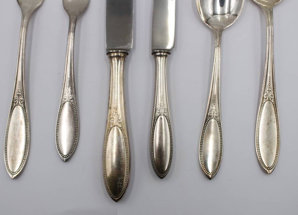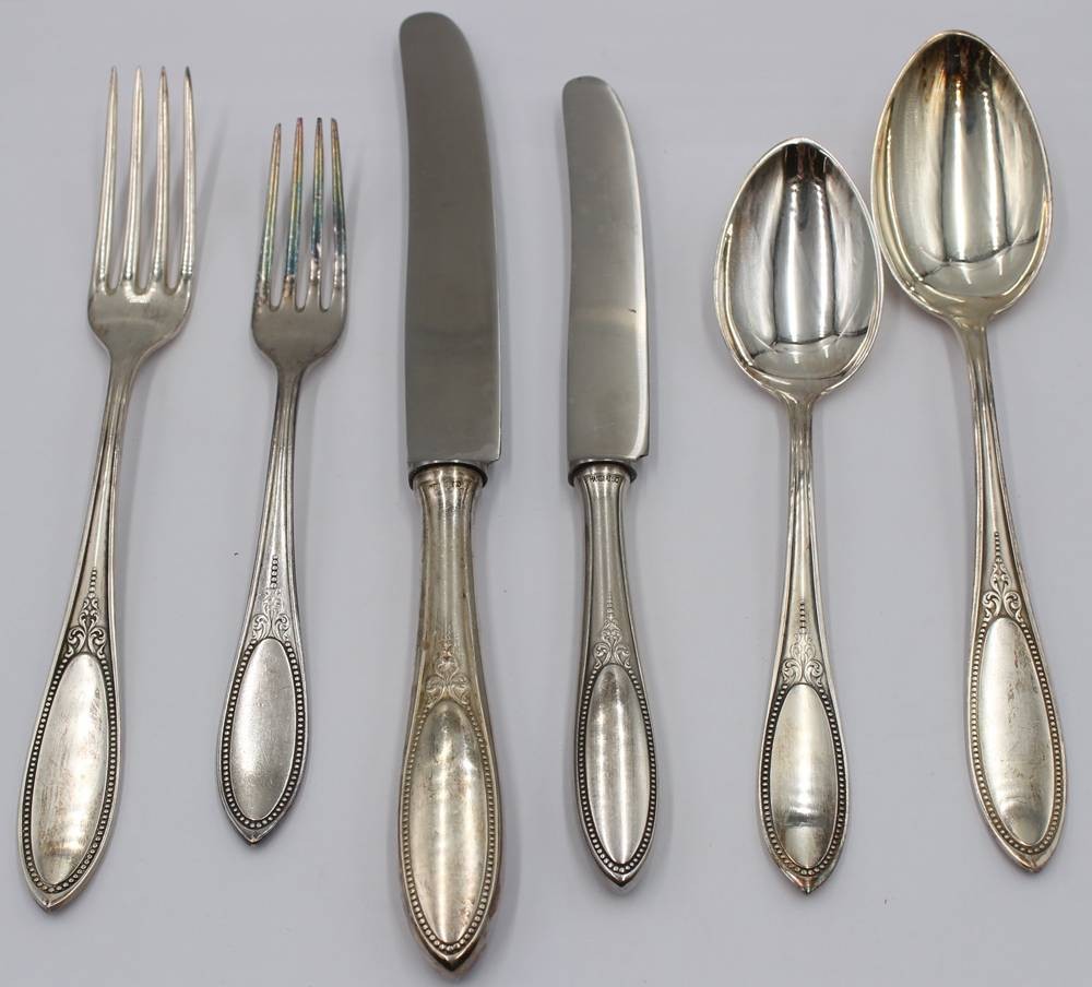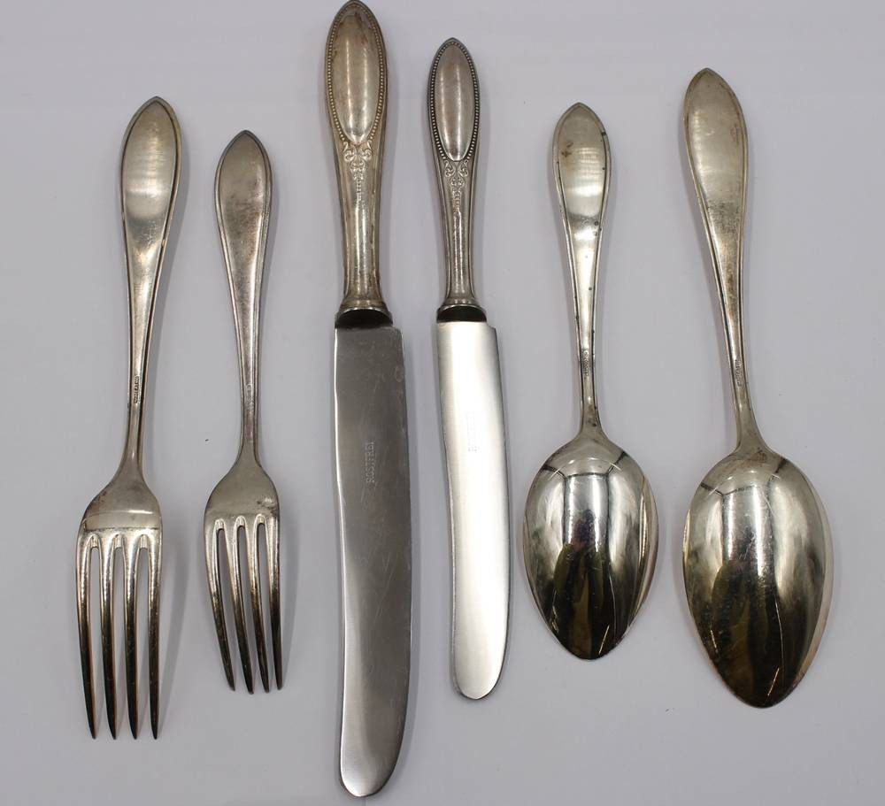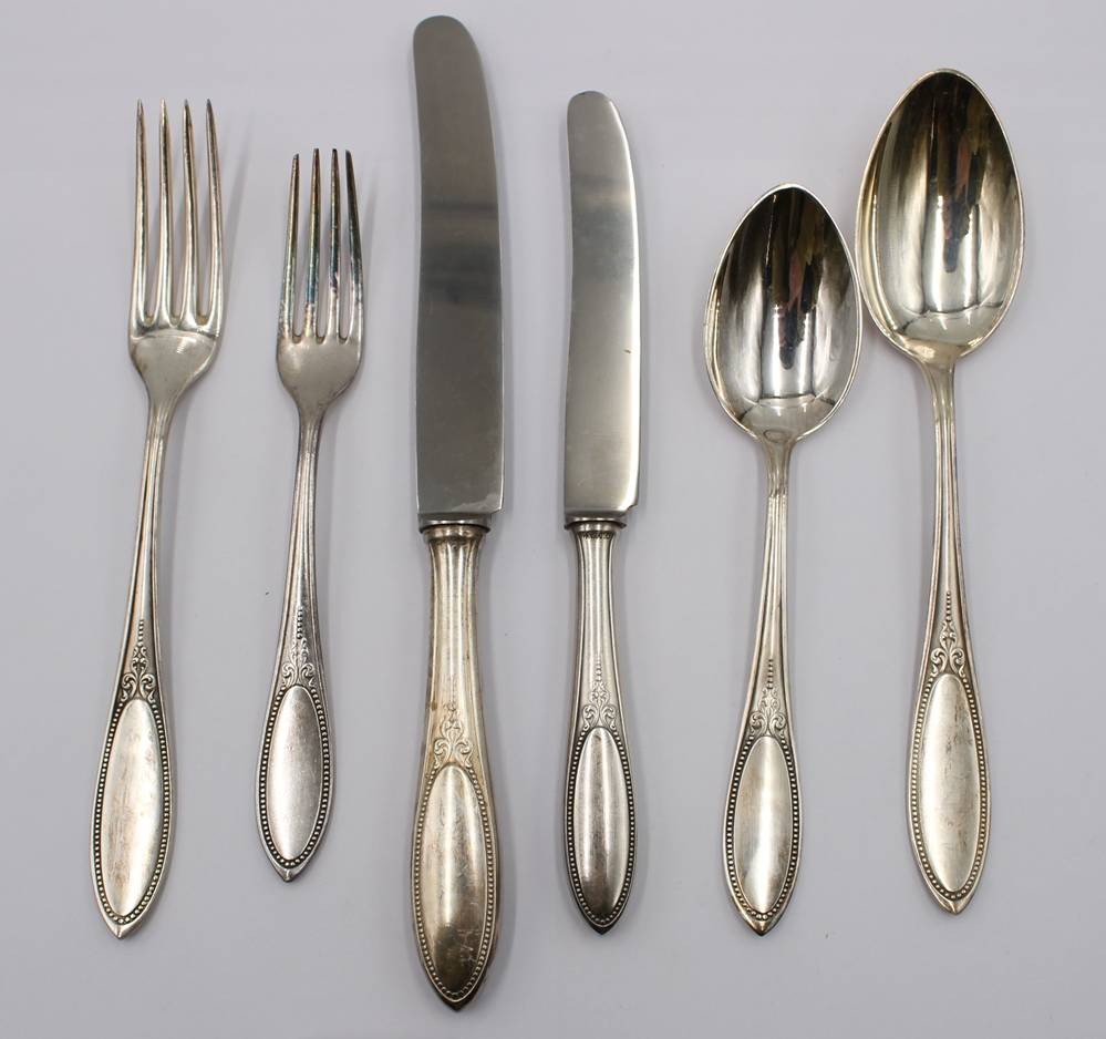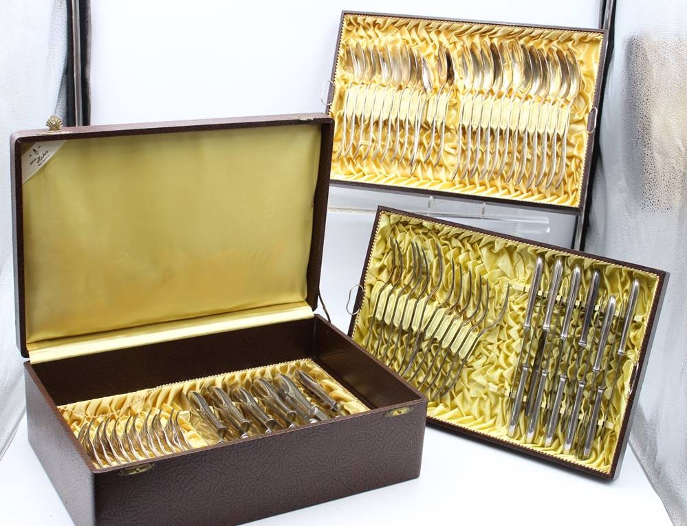 umfangreiches Besteck in Kasten um 1910, Hanseat, 100er Auflage, je 12x, kl. Messer nur 11x vorhanden [1]