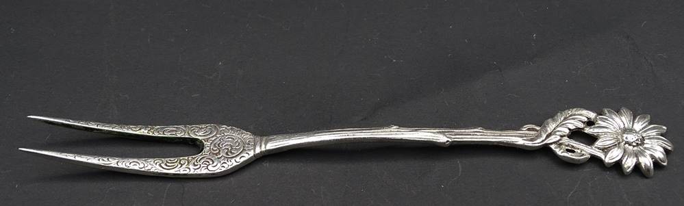 Vorlege Gabel anspruchsvoll verziert mit einer Sonnenblume , 0,800 Punziert , L. 13,3 cm , 14,2 g [1]