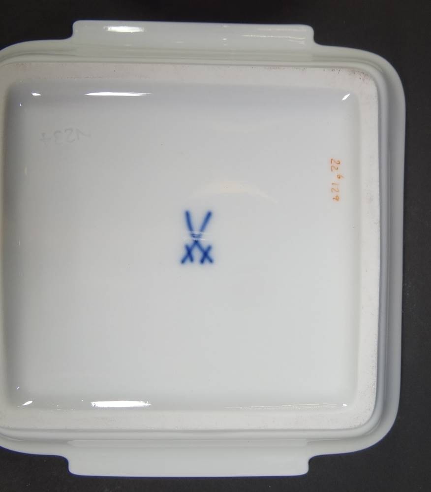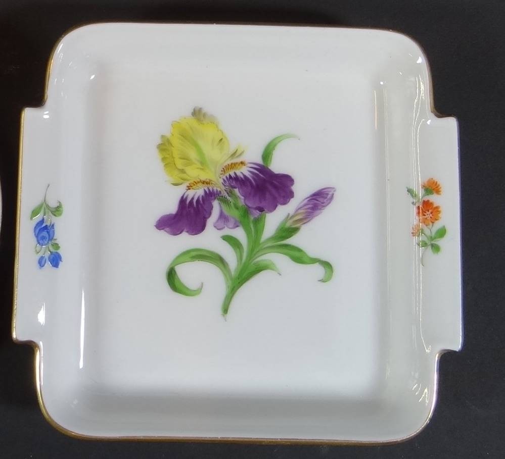 kl. eckiges Schälchen "Meissen" Blumenmalerei, Schwerter durchschliffen, 11x11 cm [1]