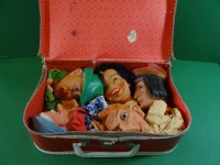 kl. alter Kinderkoffer mit 5 Handpuppen, Gummiköpfe