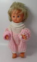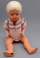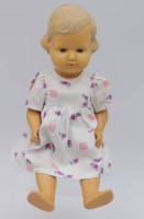 Weinende Kinderpuppe, Hände, Füße und Kopf aus Porzellan oder Kunstmasse, Glasaugen, H. ca. 30 cm, leichte Altersspuren, leicht reinigungsbedürftig
