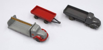 2x div. Wiking-Pritschenwagen sowie ein Anhänger, 1x fehlt eine Achse, Altersspuren, ca. L-9cm [1]