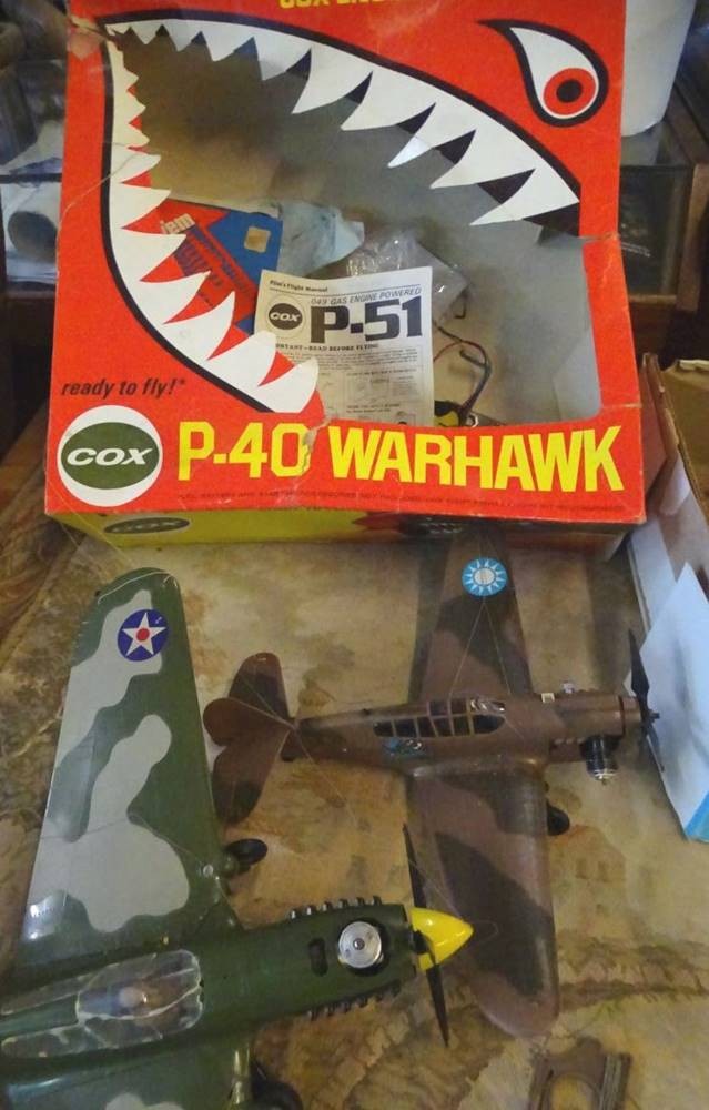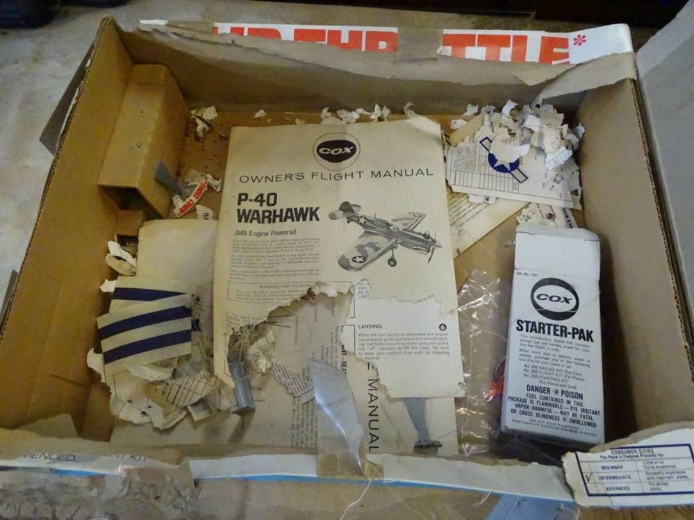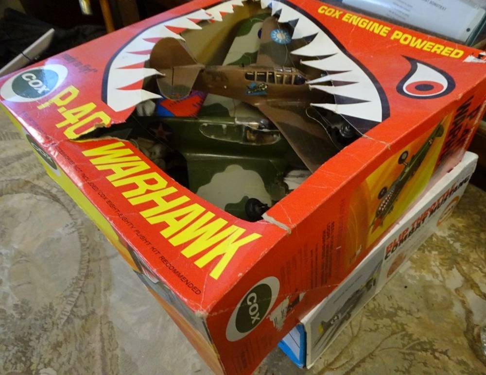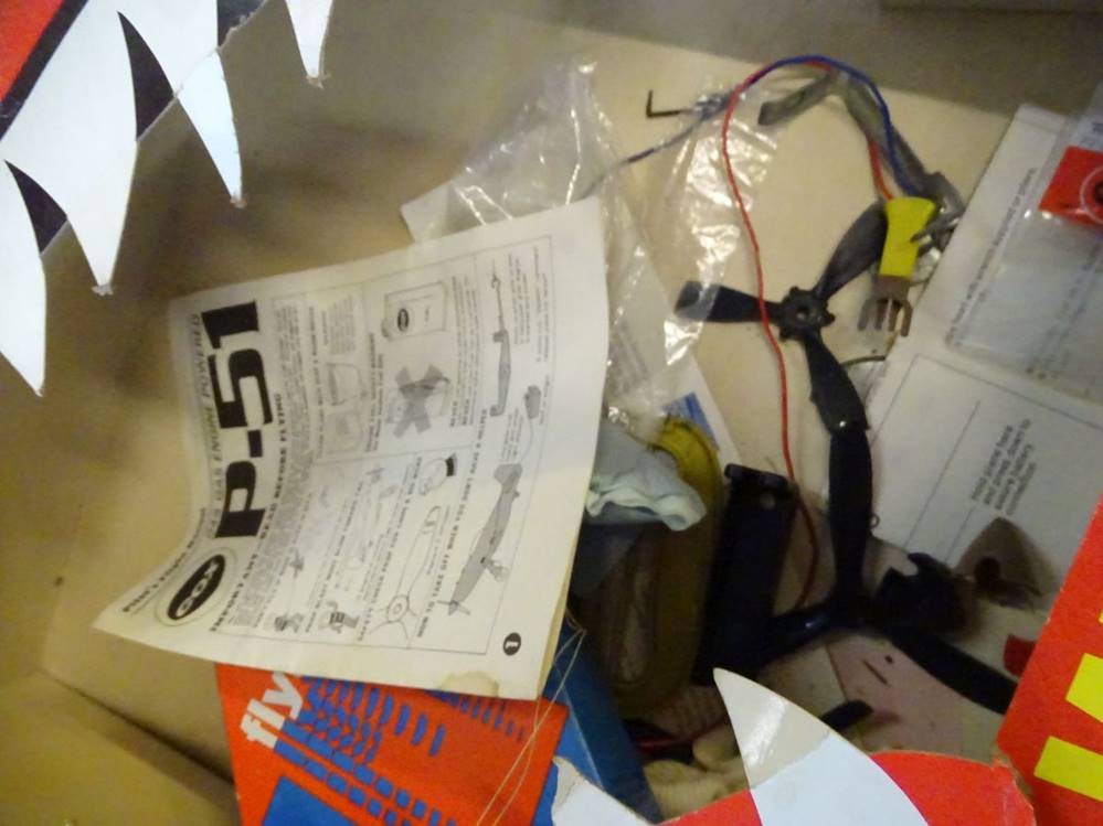 3x amerikan.--Kampfflugzeug-Modelle,mit Antrieb, 1x Gasantrieb, wohl Bausaätze, tw. nicht ganz fertig, 1x Fahrleitwerk lose, 1x fehlt Höhenruder etc., wohl 50&60-er Jahre? 2x mit Kartons ,tw. schlecht erhalten, zerissen, , an Beschreibung waren die Mäuse dran [1]