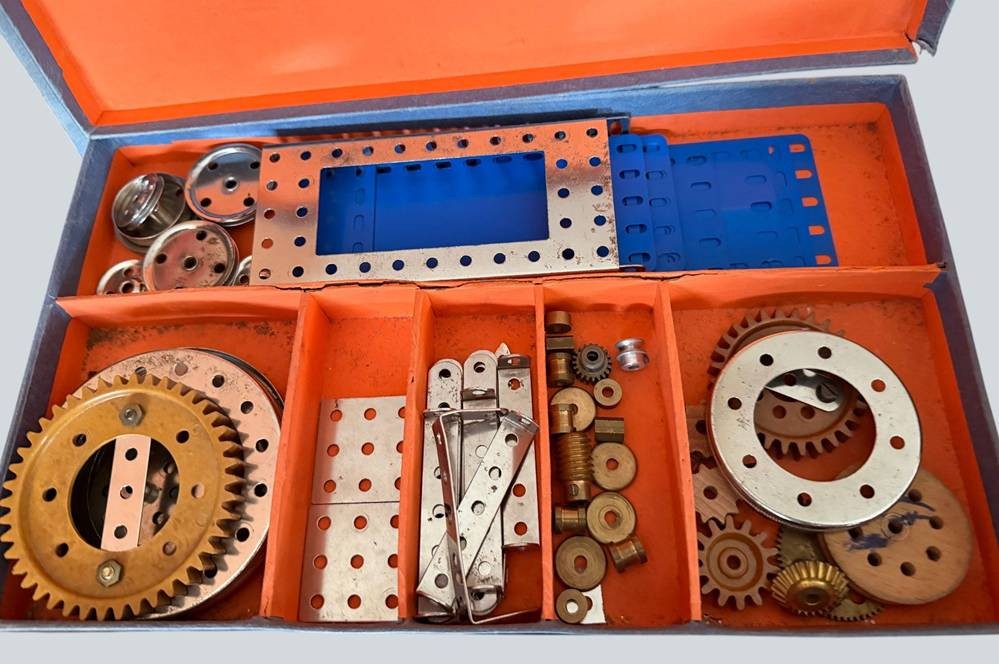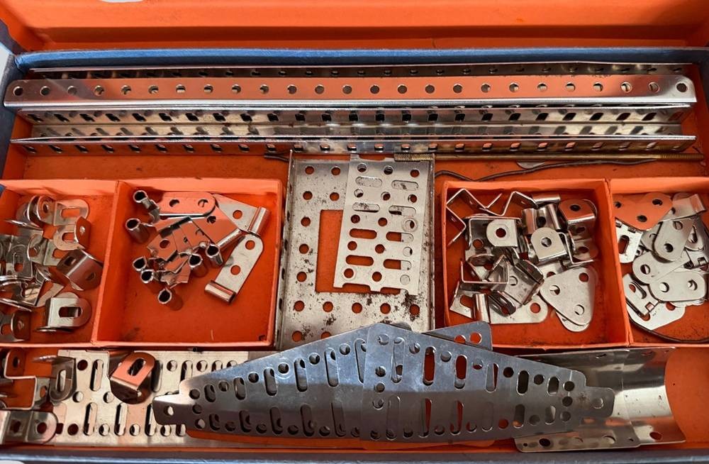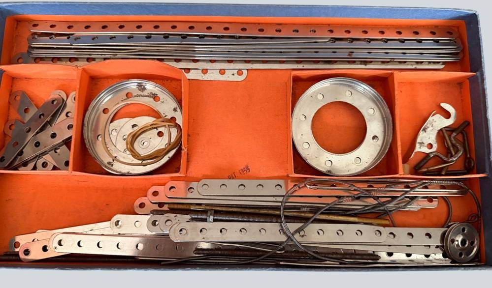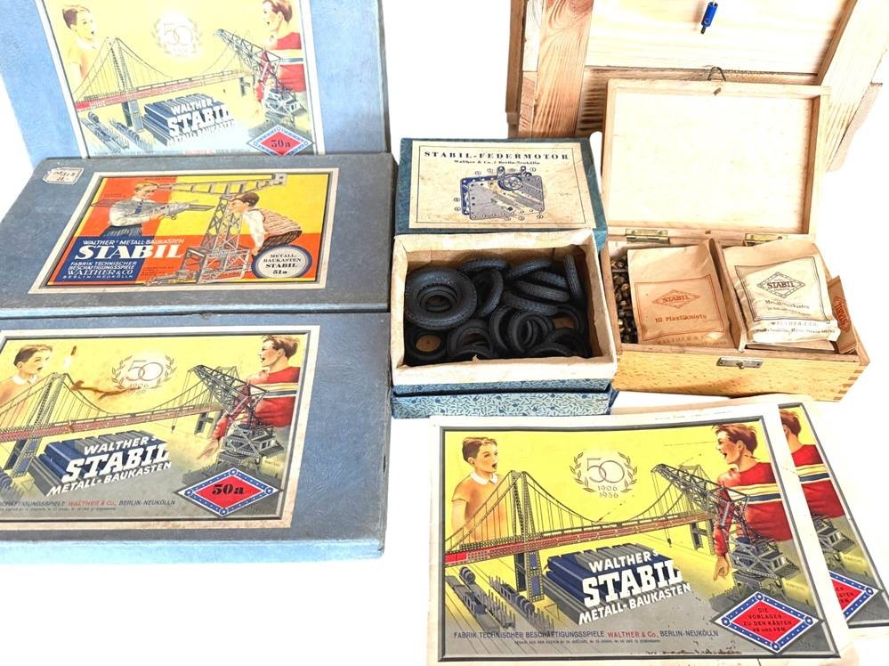 3xStabil-Metallbaukästen mit Federmotor, Reifen, Schrauben extra anbei, Vollständigkeit nicht geprüft [1]