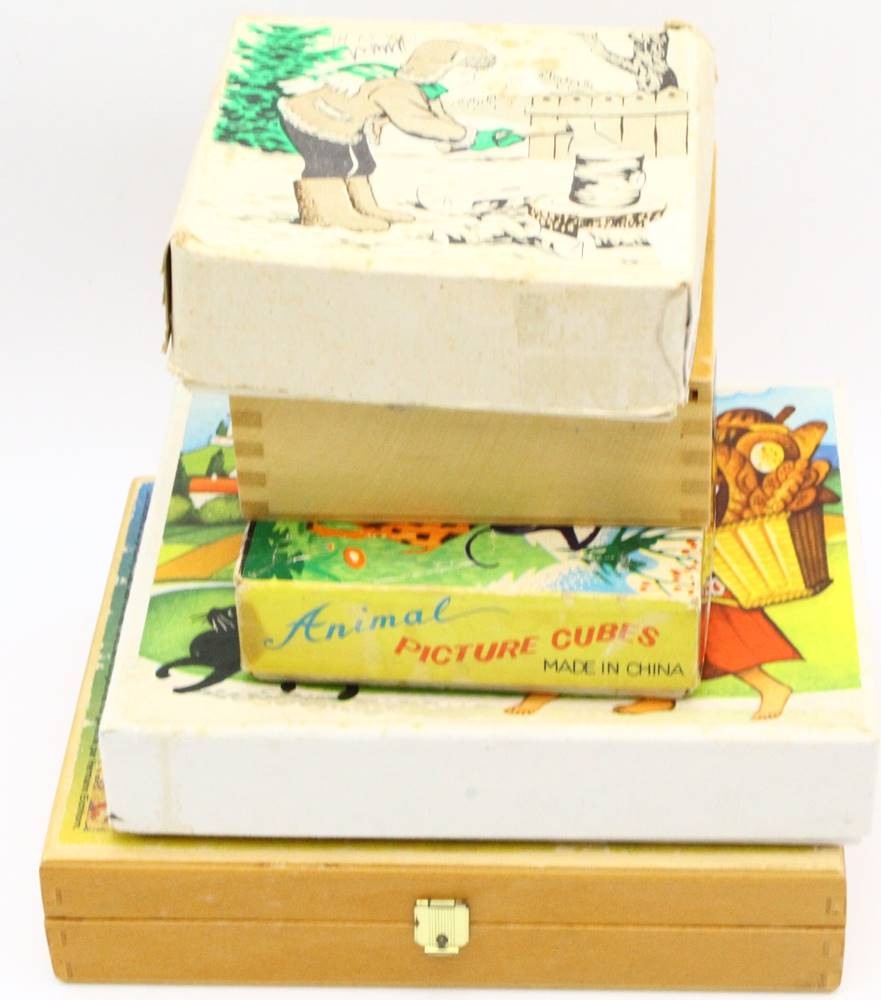 5x Kinder Puzzle-Klötze etc., Eichhorn in Holzkasten etc.,