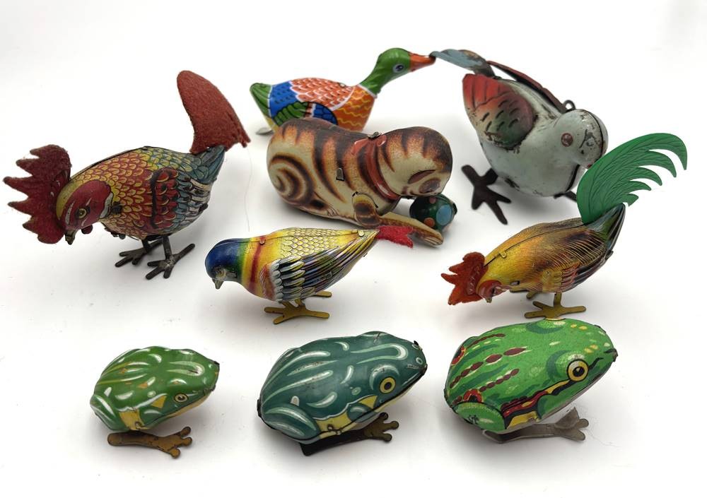 9x div. Blechspielzeug, Katze mit Ball, Pickhühner, Springfrösche etc., alle funktionieren, aber tw. Altersspuren, bespielt