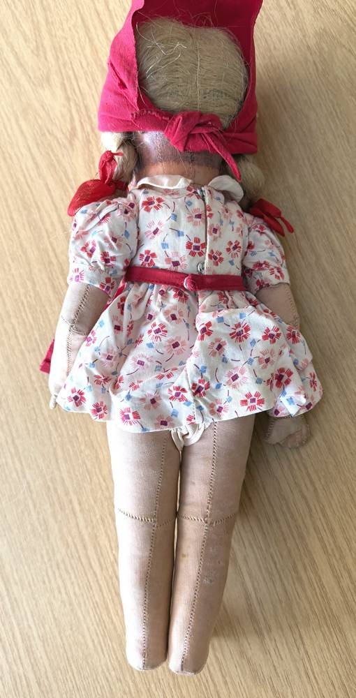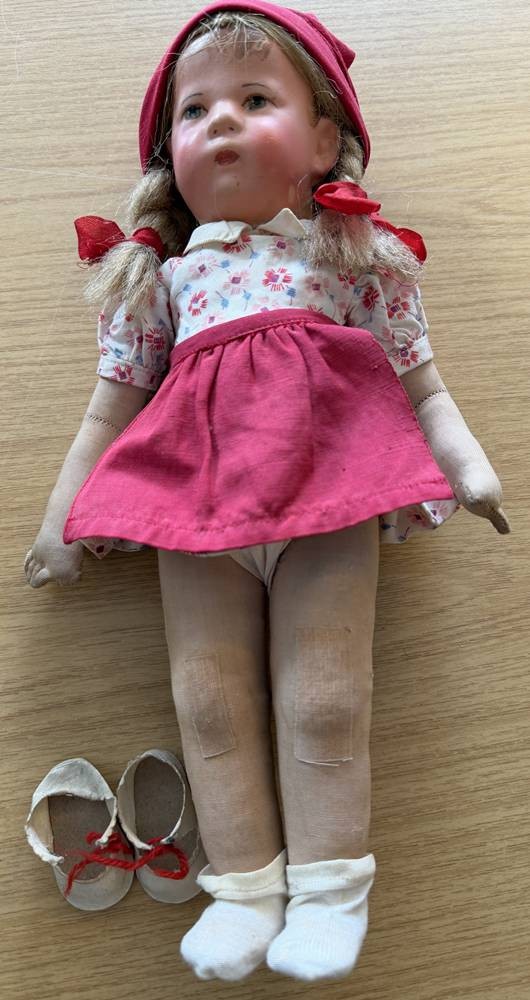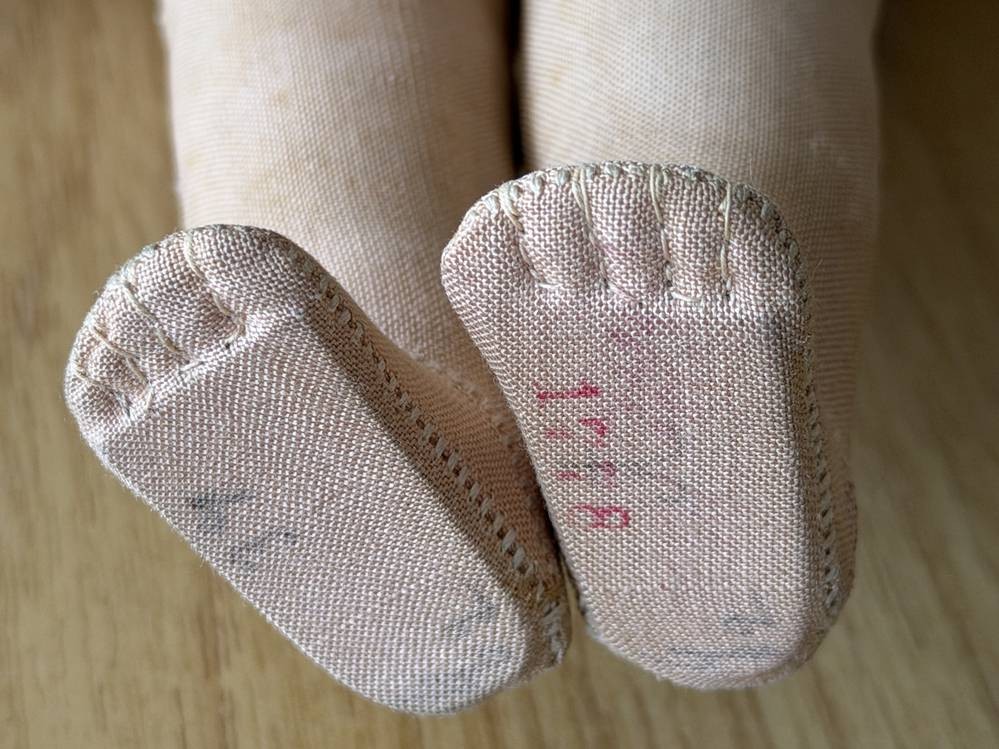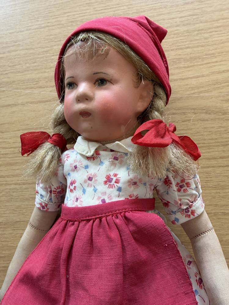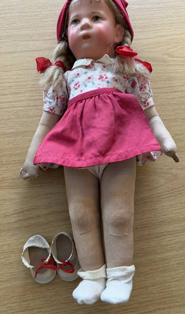 alte Käthe Kruse Puppe mit Zöpfen, Fusssohlen beschriftet, H-35 cm [1]