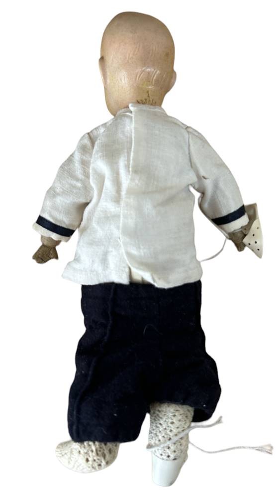 Antike Puppe der Puppenmanufaktur Wagner & Zetsche, Knabenpuppe Harald. um 1915,Alters- und Gebrauchsspuren, Halsmarke, Lederkörper mit Holzhänden, H-32 cm [1]
