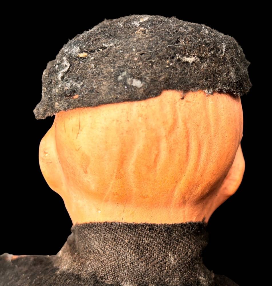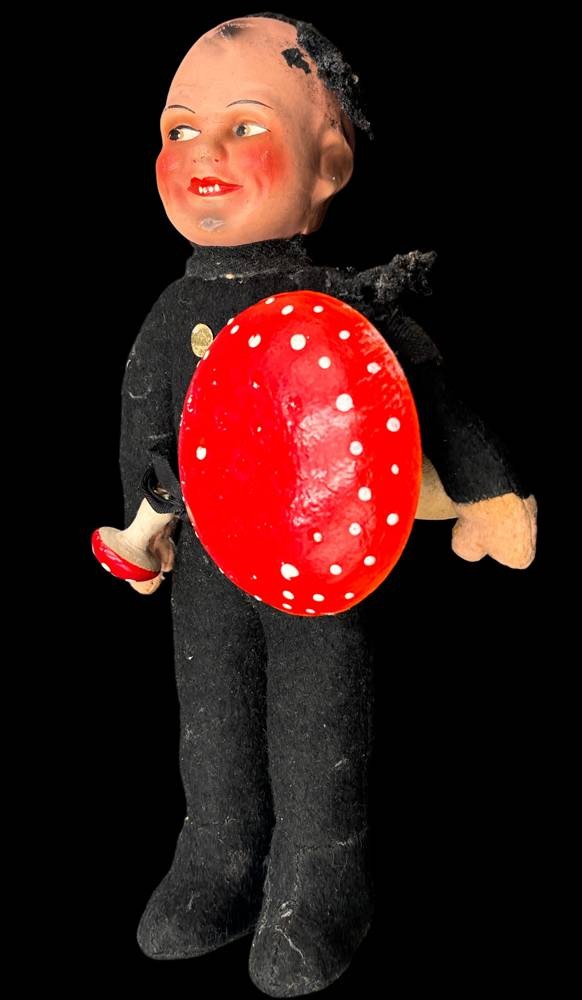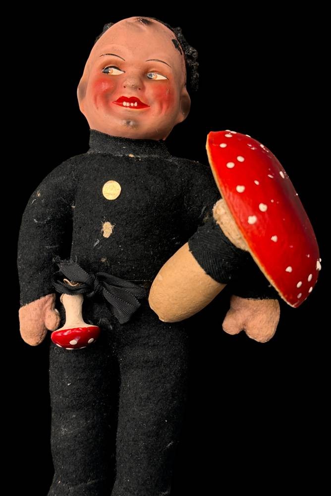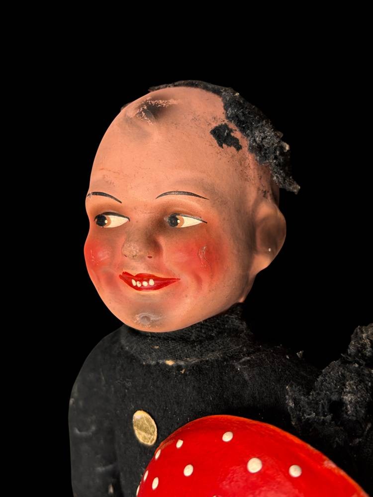 antike Stoffpuppe, Schornsteinfeger mit Pilzen, Massekopf, ungepflegter Kellerfund, wohl um 1910-20, H-26 cm [1]